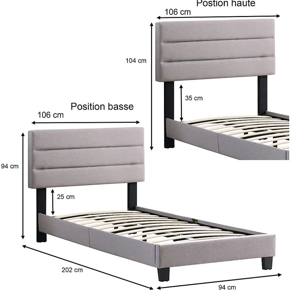 Le lit simple Florida … avec sa tête de lit capitonnée moelleuse, invite à passer une bonne nuit de sommeil. Son revêtement moderne en tissu gris s’accordera facilement avec le reste des meubles de votre chambre. Ce lit 1 place pour enfant comme adulte, est particulièrement confortable. Vous pouvez régler la hauteur de la tête de lit au montage selon 3 positions, ainsi vous pouvez ajuster ce lit selon votre taille ou la taille de votre matelas. Le sommier est inclus. Description des matériaux : – La structure du lit est recouverte d’un revêtement en tissu capitonné, de coloris gris. – Les pieds du lit sont en plastique de coloris noir. – Les lattes du sommier sont en contreplaqué. Caractéristiques du produit : – Lit simple 90 x 190 cm – Hauteur pieds de lit: 25 cm – Hauteur (position basse) : 94 cm – Hauteur (position moyenne) : 100 cm – Hauteur (position haute) : 104 cm – Sommier à lattes inclus – Matelas non inclus Livraison et montage : – Contenu de la livraison : lit, sommier, notice de montage – Le produit est livré en pièces détachées – Assemblage facile grâce à la notice – Livré sans matelas et sans décoration – Photo non contractuelle Résumé: – Hauteur tête de lit: 104 cm – Profondeur d’insertion: 4 cm – Convient uniquement avec: Sommier fagot à lattes – Description du matériel: 100% Polyester – Extras: Avec sommier à lattes – Traverse avec pied d’appui: Oui – Dimensions monté: 104 x 202 x 106 cm (H x L x L) – Couchage: 90 x 190 cm – Couleur: Gris – Matériel: Tissu de recouvrement