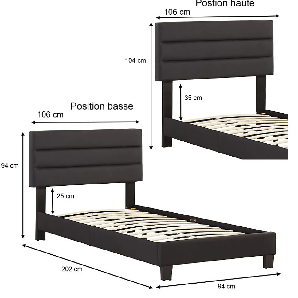 Le lit simple Florida … avec sa tête de lit capitonnée moelleuse, invite à passer une bonne nuit de sommeil. Son revêtement moderne en tissu noir s’accordera facilement avec le reste des meubles de votre chambre. Ce lit 1 place pour enfant comme adulte, est particulièrement confortable. Vous pouvez régler la hauteur de la tête de lit au montage selon 3 positions, ainsi vous pouvez ajuster ce lit selon votre taille ou la taille de votre matelas. Le sommier est inclus. Description des matériaux : – La structure du lit est recouverte d’un revêtement en tissu capitonné, de coloris noir. – Les pieds du lit sont en plastique de coloris noir. – Les lattes du sommier sont en contreplaqué. Caractéristiques du produit : – Lit simple 90 x 190 cm – Hauteur pieds de lit: 25 cm – Hauteur (position basse) : 94 cm – Hauteur (position moyenne) : 100 cm – Hauteur (position haute) : 104 cm – Sommier à lattes inclus – Matelas non inclus Livraison et montage : – Contenu de la livraison : lit, sommier, notice de montage – Le produit est livré en pièces détachées – Assemblage facile grâce à la notice – Livré sans matelas et sans décoration – Photo non contractuelle Résumé: – Hauteur tête de lit: 104 cm – Profondeur d’insertion: 4 cm – Convient uniquement avec: Sommier fagot à lattes – Description du matériel: 100% Polyester – Extras: Avec sommier à lattes – Traverse avec pied d’appui: Oui – Dimensions monté: 104 x 202 x 106 cm (H x L x L) – Couchage: 90 x 190 cm – Couleur: Noir – Matériel: Tissu de recouvrement