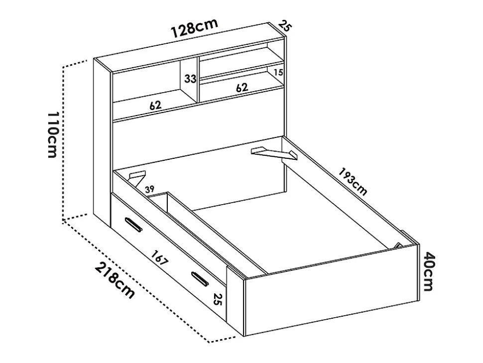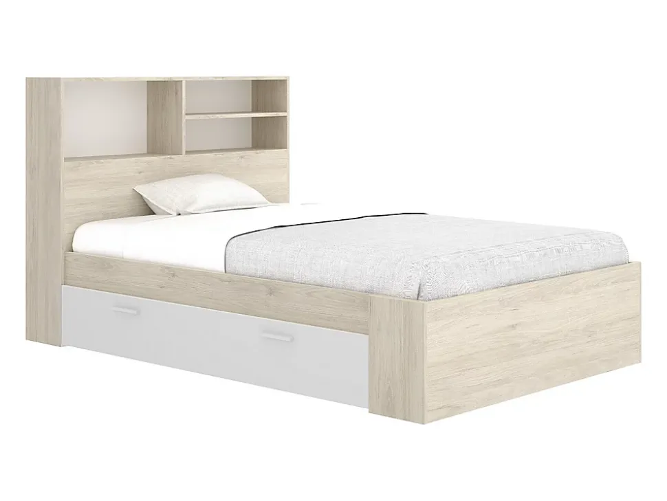 - Lit 120 x 190 cm avec rangements – Structure : Panneaux de particules – Coloris : Naturel et blanc – Dims : L217,6 x P127,4 x H110 cm – Style : Intemporel – Confort et design Intemporel avec le lit VARDIEL !