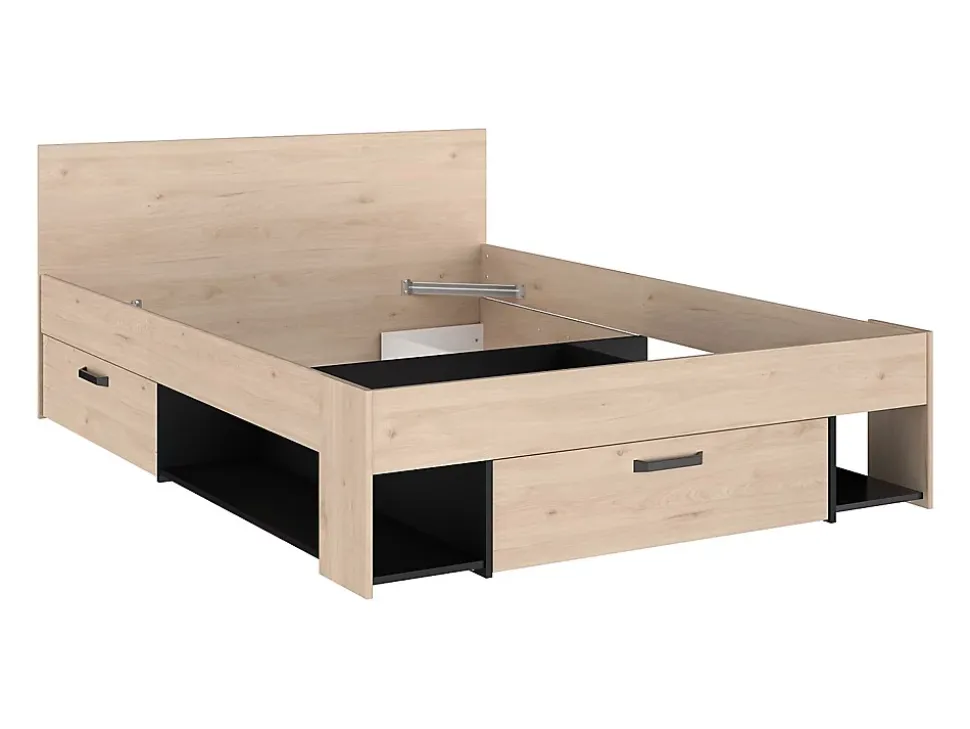 Si vous cherchez à créer du rangement dans un petit espace, le lit avec tête de lit KINSELIA est fait pour vous ! Par sa taille astucieuse et ses tiroirs et niches intégrés, vous aurez la possibilité de ranger de nombreuses affaires sans avoir besoin d’un meuble supplémentaire ! A savoir : ce lit est compatible avec tous les sommiers et matelas 140 x 190 cm et 140 x 200 cm mais nous vous proposons ici un sommier et un matelas de la taille la plus grande et non modulable, c’est-à-dire 140 x 200 cm.1 x Cadre de lit KINSELIACaractéristiques Couleur (nuance) : Naturel clair, Noir Matière (précision) : Panneau de particule Structure : Panneau de particules Finition : Mélaminé Taille (couchage) : 140 x 190 cm, 140 x 200 cm Nombre de places : 2 places Type de rangement : 3 tiroirs, 2 niches Tiroir coulissant Gamme : Good for Planet Produit : Fabriqué en France À monter soi-même : Ce lit est compatible avec tous les sommiers et matelas 140 x 190 cm et 140 x 200 cmDimensions Longueur : 146 cm Hauteur : 76 cm Profondeur : 203.5 cm Hauteur de couchage : 40.6 cm1 x Matelas classique AMBRACIECaractéristiques Technologie (âme) : Ressorts ensachés Nombre de ressorts (matelas) : 464 Soutien : Equilibré Technologie matelas (accueil) : Mousse de confort Densité (accueil) : 23 kg/m³ Accueil : Tonique Garnissage du matelas : Fibres de polyester Coutil (matière) : Coutil stretch Couleur (nuance) : Blanc Matière (précision) : 100 % Polyester Taille (couchage) : 140 x 200 cm Nombre de places : 2 places Indépendance de couchage : Indépendance de couchage Réversible été/hiver, Carénage Gamme : Good for Planet Garantie : 5 ans Produit : Fabriqué en Europe Compressé/roulé : Compressé/rouléDimensions Longueur : 200 cm Hauteur : 20 cm Profondeur : 140 cm Epaisseur matelas : 20 cm Hauteur de l’âme : 15 cm1 x Cadre à lattes KALISTACaractéristiques Couleur (nuance) : Noir Matière (précision) : Métal Epaisseur métal : 1.2 mm Taille (couchage) : 140 x 200 cm
