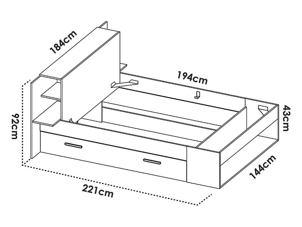 - Lit 140 x 190 cm avec rangements – Structure : Panneau de particules – Coloris : Naturel et noir – Dims : L220,5 x P183,8 x H92 cm – Style : Moderne – Alliez confort et rangement avec le lit KEROSIA !