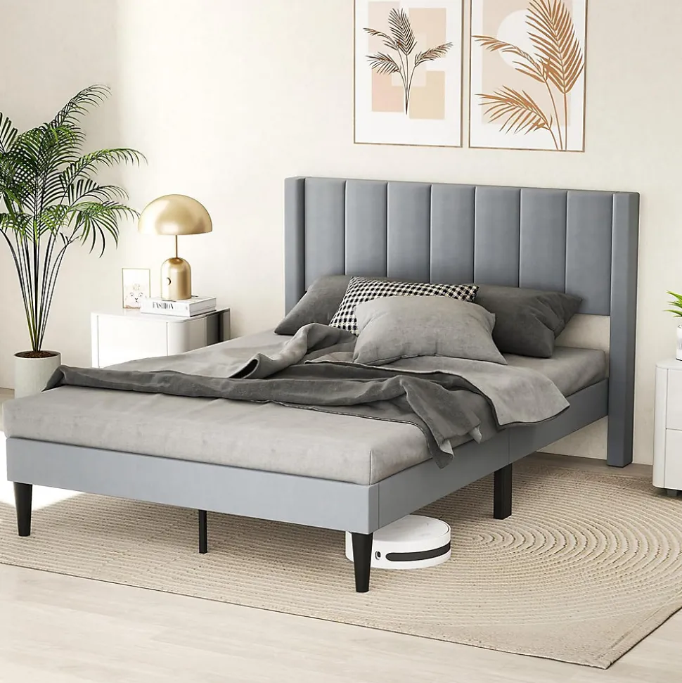 Modernisez le style de votre chambre avec notre lit rembourré et profitez d’une nuit de sommeil confortable. Ce lit double est doté d’une tête de lit rembourrée en tissu de velours doux pour la peau et d’une fermeture éclair pratique pour le nettoyage quotidien. Le cadre en bois massif avec 6 pieds centraux supplémentaires est parfait pour supporter jusqu’à 250 kg, garantissant une stabilité à long terme. Pas besoin de sommier pour pouvoir bouger sans être dérangé et dormir paisiblement. Design élégant et luxueux dans tout le cadre de lit moderne, facile à sublimer le style de la pièce, pour créer l’espace idéal pour votre repos.