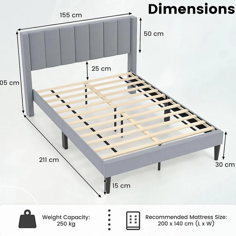 INFOS SPÉCIFIQUES:Couleur : GrisMatériau : LVL, Bois de Caoutchouc, MDF, Métal, Tissu de Velours, PlastiqueDimensions Totales : 211 x 155 x 105 cm (L x l x H)Dimensions de la Tête de Lit : 155 x 12 x 50 cm (L x l x H)Dimensions Recommandées du Matelas : 140x200CM(L x l)Hauteur sous le Lit : 15 cmCapacité de Charge : 250 kgPoids Net : 27 kgCE QUI VOUS RECEVREZ:1 x Lit Double Rembourré1 x Manuel d’Utilisation