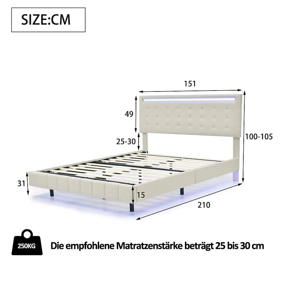 design avec pieds de lit cachés : ce lit cache le pied du lit, qui est fermement soutenu par le pied du lit et soutient efficacement le corps du lit. À première vue, il semble que vous flottiez dans l’air, offrir une expérience visuelle unique et novatrice et profiter de la sensation rêveuse et légère des nuages. tissu en lin doux et respirant – le tissu en lin est lisse et non rugueux au toucher, confortable et respirant, de sorte que vous pouvez vous allonger très confortablement sur le lit et profiter du plaisir ultime. lit moderne avec lumière led avec design de bande lumineuse, la led est contrôlée par une télécommande à 24 touches, la lumière led dispose de 4 modes de changement automatique et de 16 couleurs changeantes. Ce lit donne à votre chambre un look moderne tout en offrant une source de lumière supplémentaire, une protection douce des yeux et une brillance uniforme. robuste et durable – le cadre de lit est en mdf massif et panneaux de particules. L’armature en métal en forme de croix assure un maintien dense et solide. La construction assure la durabilité et un cadre de lit stable sans tête de lit vacillante. remarque : ce produit contient 2 paquets, veuillez vous assurer que les deux colis sont arrivés avant de commencer l’assemblage !description du produit140x200 cm dimensions totales et poids du lit : 210x151x100-105cm (lxlxh); 37kgdétail des dimensions du produit : veuillez vous référer à l’image de la taillenombre de colis : 2capacité de charge : 250 kgépaisseur recommandée du matelas : 12-24 cmmatériau du produit : mdf + métal + tissu en lincouleur : beigenombre de lattes : 12inclus un matelas : non