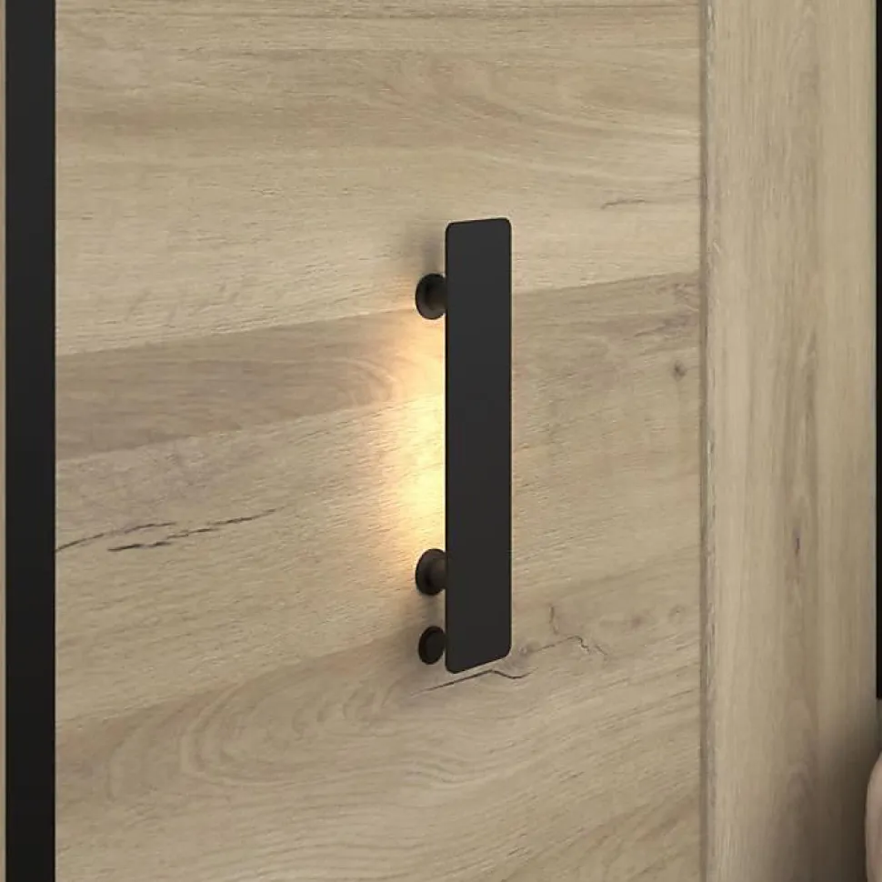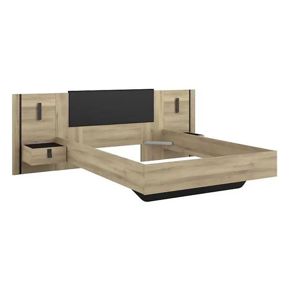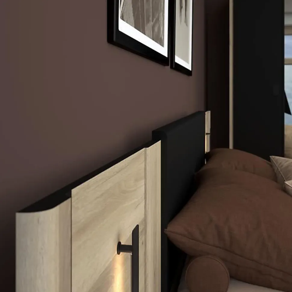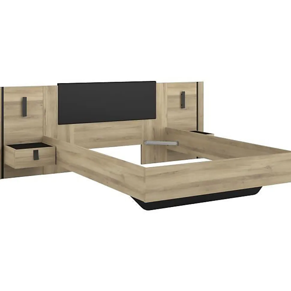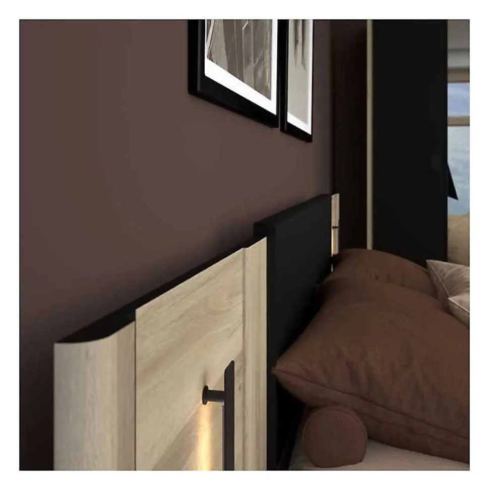 - Finition décor imitation chêne avec accents noir mat et insert central rembourré noir pour la tête.