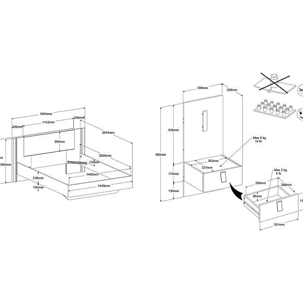- Compatible matelas/sommier 140×190 cm ou 140×200 cm (réglage par cale) ; matelas non inclus.