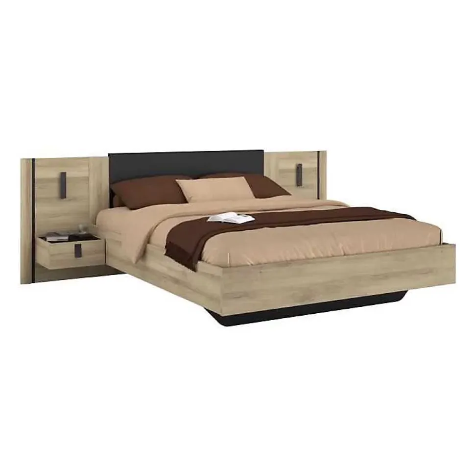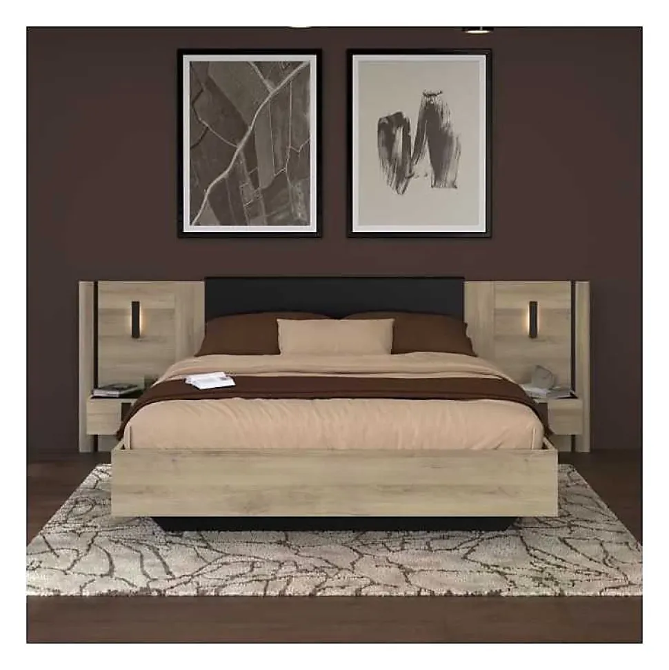 Lit PARISOT KIERAN 140×190/200 cm avec tête large et 2 chevets flottants intégrés, finition chêne et accents noirs, éclairage LED intégré, style plateforme, fabriqué en France, vendu sans matelas ni sommier, garanti 2 ans.