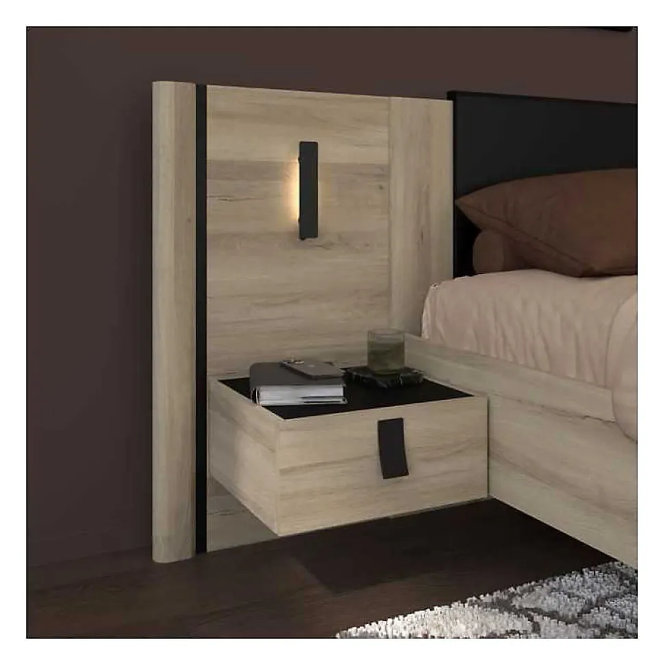 Caractéristiques du produitLit 140×190/200 cm PARISOT KIERAN finition chêne et noir matTête de lit large intégrant 2 chevets muraux flottants avec tiroirsÉclairage LED intégré sur chaque chevet pour une ambiance chaleureuseStructure en panneaux de particules de qualité, socle noir affleurant pour effet suspenduCompatible matelas 140 x 190 cm ou 140 x 200 cm (réglage par cale)Structure et finitionStructure : style plateforme avec cadre périmétrique en bois et plinthe noire affleurante pour un rendu suspendu et un dégagement sous le litRevêtement : décor imitation chêne naturel avec veines visibles et surfaces noires mates lisses sur l’insert de tête, dessus de tiroir et plintheTête de lit et chevetsTête : large tête de lit intégrée sur toute la largeur avec insert central rembourré noirChevets : deux chevets muraux flottants intégrés, chacun avec un tiroir et une poignée sangle noire, dessus noir matFonctionnalités et compatibilitéRangement : deux tiroirs intégrés dans les chevets pour un rangement discretÉclairage : LED intégré aux chevets pour lecture et ambianceCompatibilité : conçu pour sommier et matelas 140 x 190 cm ou 140 x 200 cm (adaptable)Assemblage et garantieLivré en 3 colis, assemblage requis ; composants : tête, panneaux latéraux, cadre et plintheOrigine et garantie : fabriqué en France, garantie 2 ans