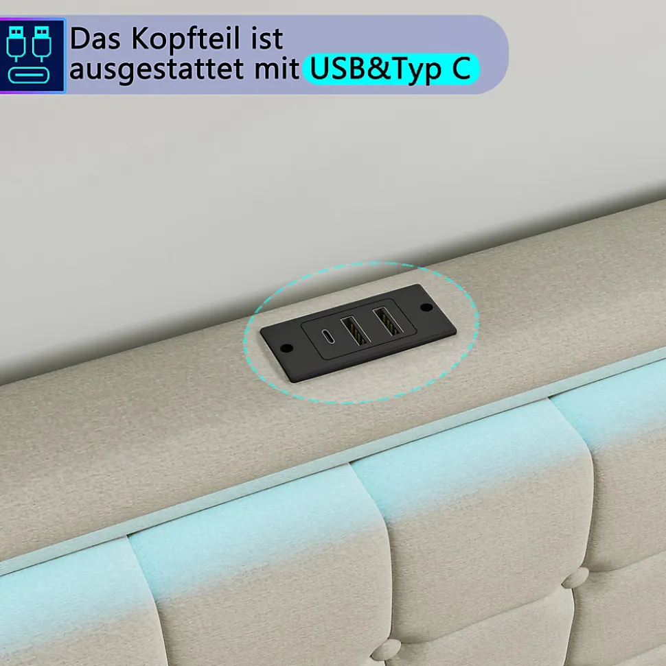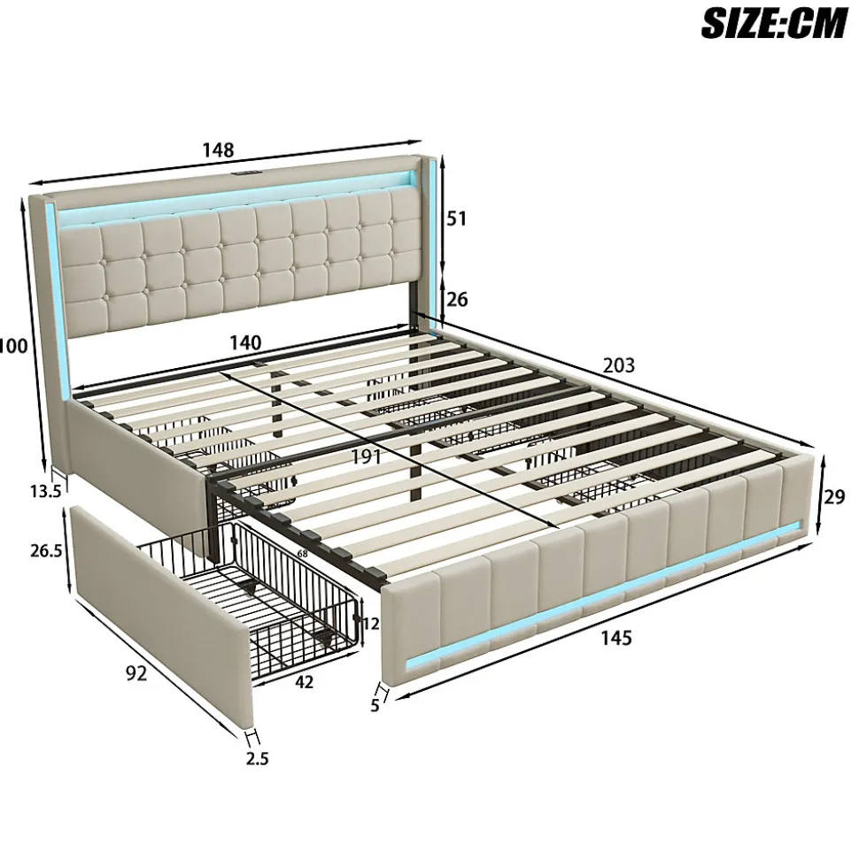 Éclairage LED : Les ailes latérales, la tête et le pied du lit sont équipés de lumières LED, ajoutant une touche de modernité à votre chambre à coucher. La tête de lit LED peut servir de dossier confortable lorsque vous lisez ou regardez la télévision. À l’aide de la télécommande, vous pouvez modifier les couleurs et la luminosité pour vous allonger confortablement.Station de recharge USB : Ce lit combine avec ingéniosité un design élégant et un confort maximal. Les ports de chargement à la tête du lit comprennent des ports USB et Type-C, vous permettant de charger vos appareils électroniques. Vous pouvez ainsi charger votre téléphone portable et votre tablette avant de vous coucher, pour une utilisation confortable dans votre lit.Matériau doux pour la peau : Le tissu en lin doux réduit efficacement les risques de blessures pour vous ou votre famille dus aux coins et aux bords tranchants pendant l’utilisation, s’intégrant parfaitement à votre chambre à coucher, offrant un style chic et minimaliste, mettant en valeur votre recherche de qualité de vie.Conception de rangement : Le lit est doté de quatre grands tiroirs intégrés sous le sommier à ressorts, offrant un espace de rangement pratique pour vos draps, couvertures, oreillers, vêtements, chaussures, etc. Grâce aux roulettes situées sous les tiroirs, ils peuvent être facilement ouverts et fermés, rendant votre chambre plus ordonnée.Description: Matériau : lin + MDFCouleur : Gris Nombre de colis : 2Assemblage requis : ouiTemps de montage estimé : 1 heureNombre de personnes recommandées : 2Dimensions du produit : 203 x 148 x 100 cmDimensions du lit : 140 x 190 cm (sans matelas)Nombre de sommiers : 12Poids du produit : 50 kgCharge maximale du lit : 200 kg