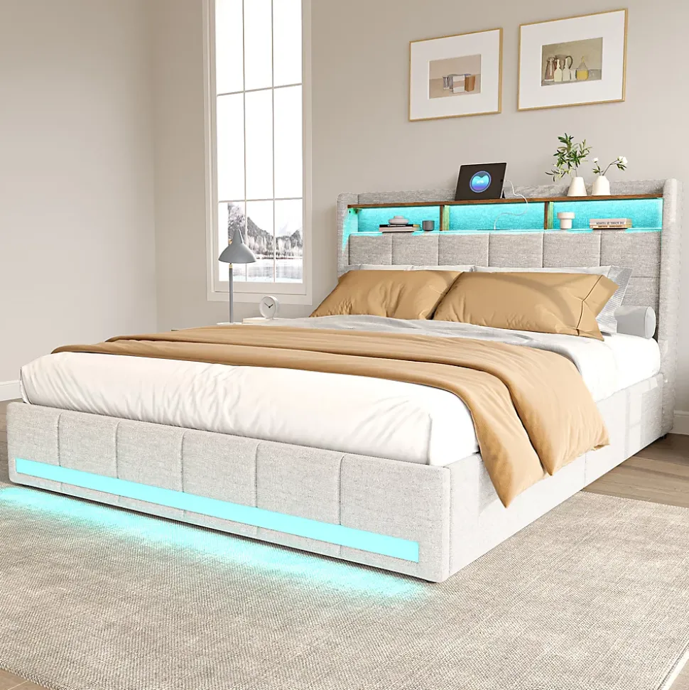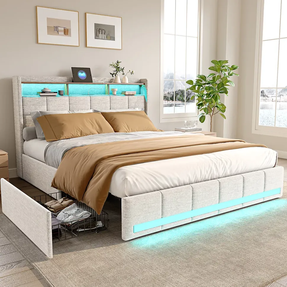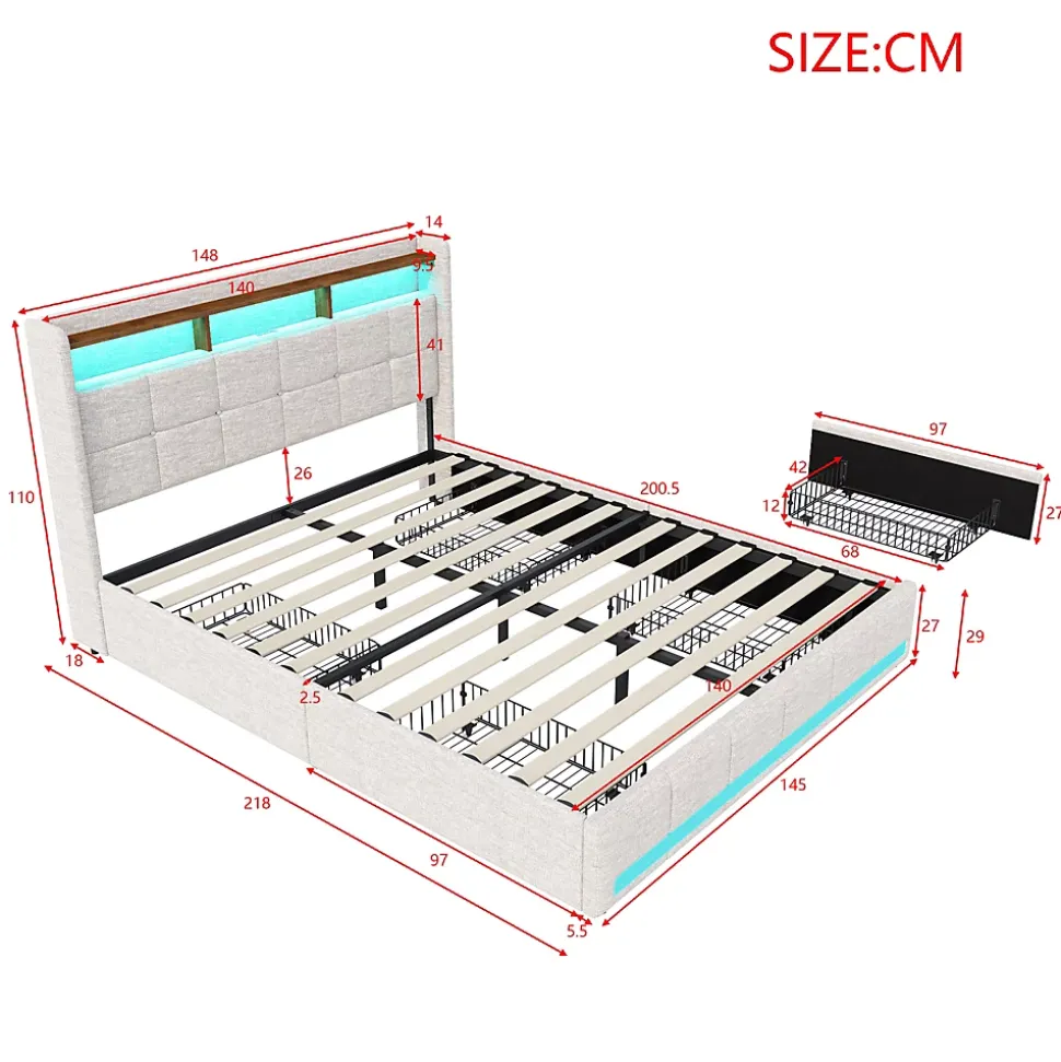 【Éclairage LED personnalisable】 : L’éclairage LED de ce lit offre une touche moderne à votre espace personnel. Grâce à la télécommande ou à l’application mobile, vous pouvez moduler les couleurs et les modes d’éclairage pour créer une atmosphère sur mesure, que vous souhaitiez un éclairage doux pour une soirée détente ou un éclairage dynamique pour commencer la journée.【Tête de lit dotée de ports USB/Type-C】 : Cette fonctionnalité ingénieuse est un véritable atout pour ceux qui ont besoin de rester connectés. Les ports USB/Type-C intégrés à la tête de lit vous permettent de recharger votre smartphone ou votre tablette pendant la nuit, tout en ayant vos appareils à portée de main.【Confort et sécurité】 : Le lit est doté de sommiers à lattes en bois massif et en métal, garantissant un soutien robuste et un confort de sommeil optimal. Le revêtement doux du lit non seulement offre une sensation agréable au toucher, mais réduit aussi les risques de blessures dues aux coins et arêtes vives. Il est ainsi adapté aux familles avec enfants.【Lit avec Rangement】 : La tête de lit offre également un espace de rangement astucieux. Ses trois compartiments ouverts sont parfaits pour garder à portée de main vos objets du quotidien ou pour exposer vos objets déco. De plus, le lit dispose de quatre tiroirs spacieux, idéals pour le rangement de vos vêtements et linge de maison. C’est la solution parfaite pour optimiser l’espace dans les petits appartements ou studios【Facilité de montage】 : Ce lit est livré avec des instructions de montage claires et tous les outils nécessaires, ce qui facilite grandement son installation.Description du produit:Dimensions du produit : 218 L x 148 l x 110 HMatériau : Bois + Métal + LinCharge maximale : Poids de l’utilisateur : 150 kgType de charge : 2 USB+Type-CMontage nécessaire : ouiType de sommier : comprend un sommier à lattes
