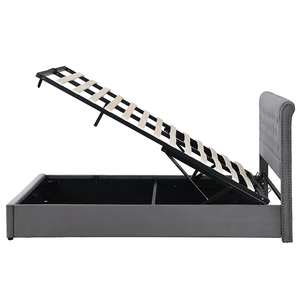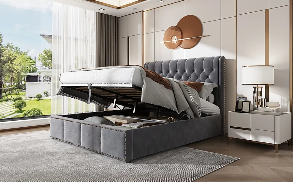 Design & styleCe canapé-lit adopte un style européen minimaliste avec des lignes épurées et une finition sobre. La tête de lit haute de 103 cm, en velours gris, offre un appui confortable et une silhouette élégante. Les clous décoratifs soulignent le design sans ostentation et permettent une intégration facile dans un intérieur contemporain ou classique. Les proportions sont étudiées pour optimiser l’espace.Fonction & rangementMécanisme à vérin hydraulique pour soulever le sommier et accéder au coffre de rangement, pratique pour draps, couettes et linge de saison.Sommier à lattes inclus ; couchage 140×190 cm (matelas non fourni) pour choisir librement le confort souhaité.Capacité de charge maximale : 300 kg. Poids net approximatif : 45,3 kg.Matériaux & caractéristiquesStructure avec éléments renforcés et sommier à lattes, assise rembourrée en mousse, revêtement velours doux. Finitions soignées garantissant un rendu qualitatif pour un usage domestique. Les vérins hydrauliques et les détails cloutés combinent esthétique et fonctionnalité.Installation & livraisonProduit livré démonté en 2 colis pouvant arriver séparément. Montage requis selon la notice ; deux personnes recommandées pour manipuler le sommier et installer le mécanisme hydraulique. Vérifier l’état des pièces à la réception et suivre attentivement les instructions.Entretien & informations complémentairesEntretien simple : dépoussiérer régulièrement et nettoyer le velours avec un chiffon doux légèrement humide. Éviter produits abrasifs ou détergents agressifs. Dimensions indicatives, tolérance ±2–3 cm. Variations de teinte possibles entre photos et produit réel. Matelas non inclus. Pour toute question, consulter la notice ou contacter le vendeur.