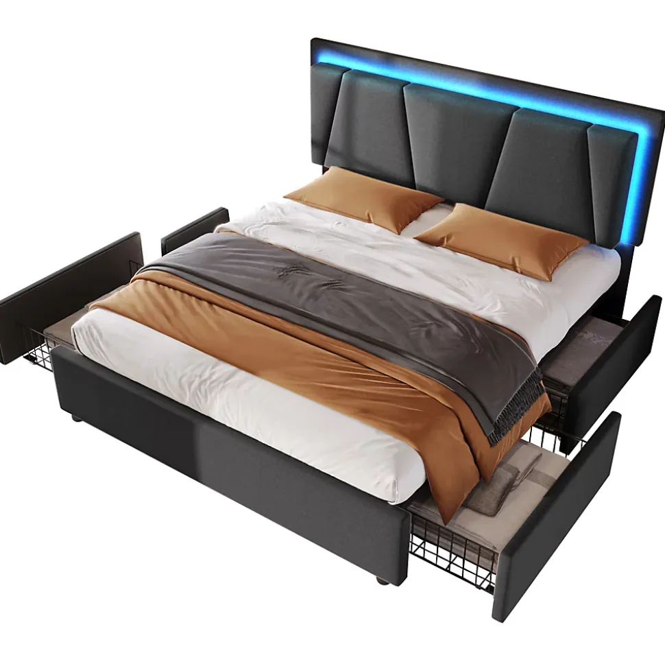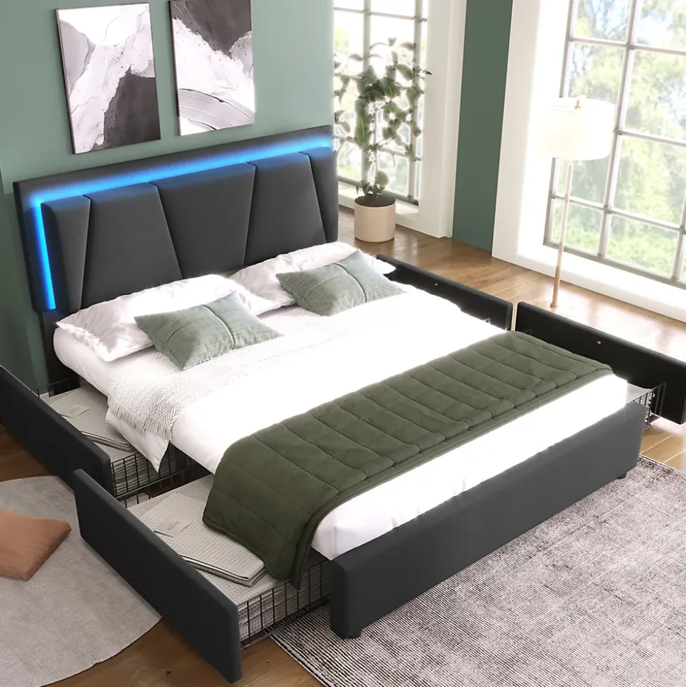 Design & styleCe lit 140×200 cm associe une silhouette contemporaine et une tête de lit géométrique rembourrée en tissu type lin gris, rehaussée de boutons décoratifs. La combinaison métal/tissu apporte une présence élégante et discrète dans la chambre.Fonctionnalité & rangement Quatre grands tiroirs équipés de roulettes pour une ouverture et fermeture aisées ; dimensions intérieures 74,5×49,5×15 cm pour un rangement modulable. Attaches latérales permettant de fixer les tiroirs au cadre lorsque non utilisés, contribuant à un maintien soigné et à une chambre ordonnée. LED intégrée à la tête de lit avec télécommande pour régler couleurs et intensité et créer une ambiance adaptée au repos.Matériaux & soliditéCadre principalement en métal pour une tenue durable et stabilité renforcée par des pieds de support centraux ; sommier à lattes en bois compatible avec la majorité des matelas 140×200 cm (épaisseur recommandée 25–35 cm). Charge maximale annoncée : 272 kg.Dimensions & compatibilitéDimensions totales approximatives : 149x207x102–112 cm (LxP xH avec tête de lit réglable). Matelas non fourni. Compartiments internes et proportions conçus pour une utilisation quotidienne optimisée.Installation & emballageMontage requis, deux personnes conseillées. Produit livré en 2 colis pouvant arriver séparément ; vérifiez l’arrivée des deux paquets et contactez le service client en cas de pièces manquantes. Pour déplacer le lit, le soulever plutôt que le faire glisser afin de préserver la structure.