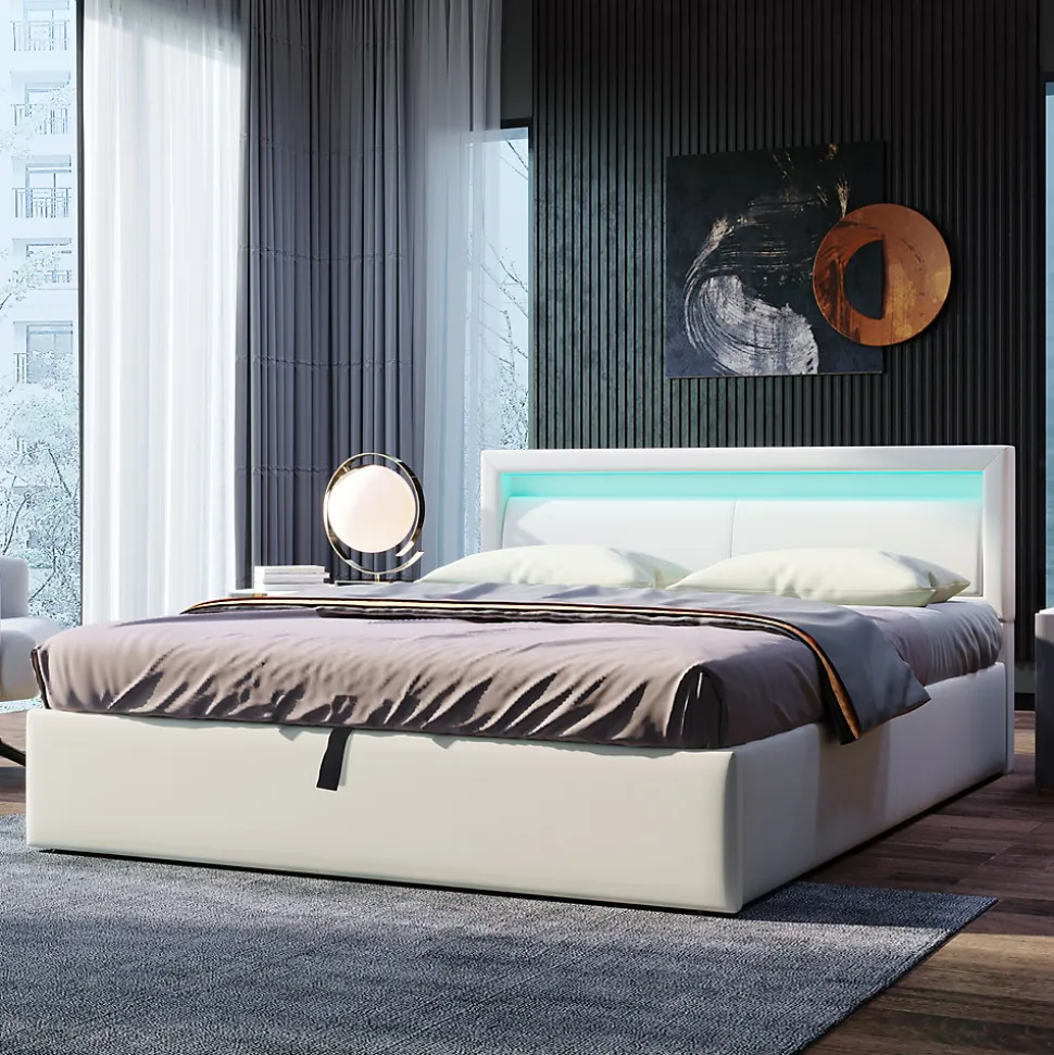 Design & styleCe lit 140×200 cm présente un design moderne et épuré, avec une tête de lit rembourrée haute de 80 cm et un éclairage LED périphérique diffusant une lumière blanche chaleureuse. Le revêtement en PU blanc apporte un rendu esthétique doux et facile à intégrer dans des ambiances contemporaines ou jeunesse.Fonctionnalité & rangement Grand coffre de rangement accessible par le sommier relevable : espace pratique pour ranger couettes, oreillers, linge de lit ou accessoires. Sommier à lattes inclus avec renfort central, conçu pour protéger la suspension du matelas et assurer une bonne tenue au quotidien. Matelas non fourni, solution idéale pour optimiser l’espace lorsqu’il y a peu de place pour des armoires.Matériaux & entretienStructure en MDF robuste et revêtement en PU (similicuir) agréable au toucher et simple à entretenir. Capacité d’utilisation jusqu’à 150 kg. Entretien facile : nettoyer la surface avec un chiffon doux et un détergent doux si nécessaire.Installation & livraisonMontage requis, deux personnes recommandées pour manipuler les éléments et fixer la structure en toute sécurité. Produit livré en 2 colis ; selon les transporteurs, les colis peuvent être livrés séparément et à des moments différents.