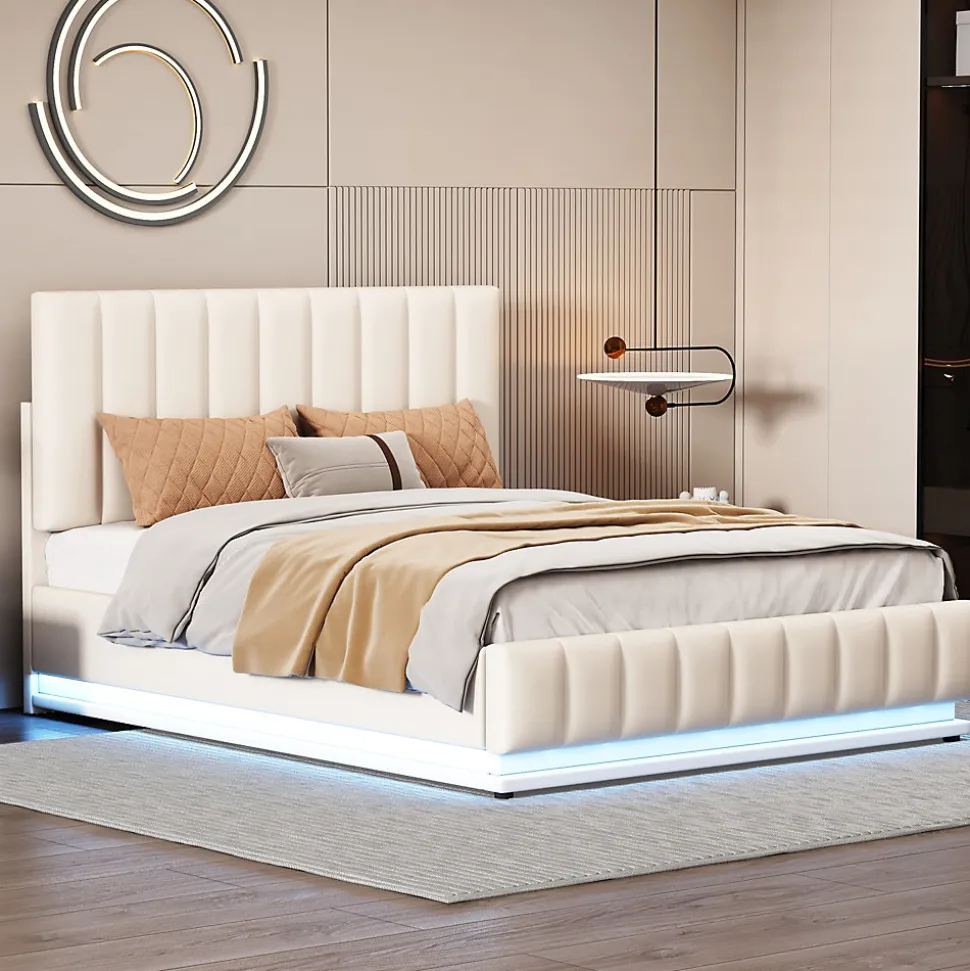 - Design contemporain tapissé en similicuir blanc avec tête de lit réglable et éclairage LED intégré ; télécommande 24 touches pour 16 couleurs et 4 modes automatiques, ambiance modulable.