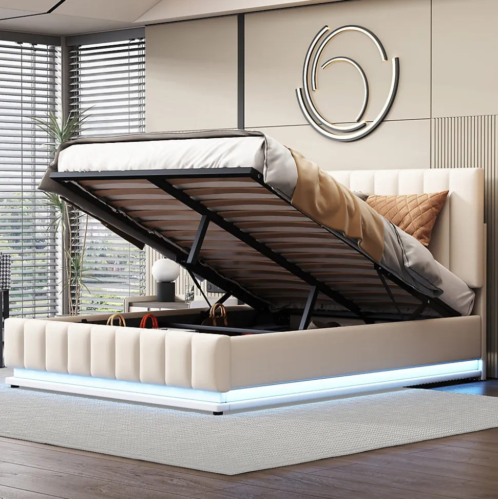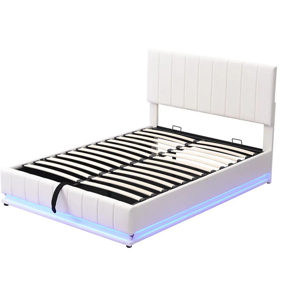 Design & styleCe lit 140×200 cm combine un revêtement en similicuir blanc et une tête de lit réglable pour un rendu soigné et confortable. Les bandes LED intégrées offrent 16 couleurs et 4 modes automatiques, pilotables par une télécommande 24 touches pour adapter l’éclairage à chaque moment.Fonctionnalité & rangement 35 cm d’espace utile sous le sommier, idéal pour ranger couettes, oreillers et vêtements, équivalent à un grand volume de rangement. Mécanisme hydraulique double assurant une ouverture assistée, stable et sécurisée pour un accès aisé au coffre. Sommier à lattes métalliques conçu pour maintenir la structure sans affaissement et répartir la charge jusqu’à 250 kg.Matériaux & soliditéStructure réalisée en MDF et métal, recouverte de similicuir résistant. Renforts centraux et cadre robuste garantissent une bonne stabilité et une durabilité adaptée à un usage quotidien. Matelas non inclus.Entretien & confortSurface tapissée facile d’entretien : un chiffon doux suffit pour un nettoyage régulier. Le sommier offre un soutien ferme et homogène, contribuant à un couchage confortable et sécurisé.Installation & livraisonProduit livré en 2 colis (poids total indicatif 45 kg), les colis peuvent arriver séparément ; prévoir 2 à 3 jours si les envois sont distincts. Montage requis, estimé à environ 30 minutes à deux personnes ; outils courants fournis, aucun outil électrique nécessaire.