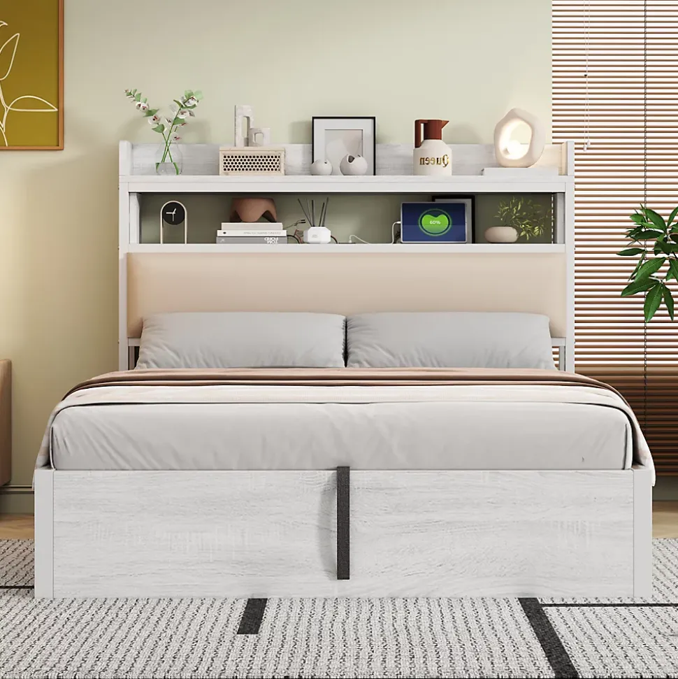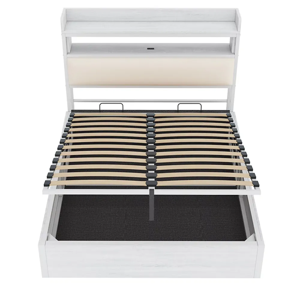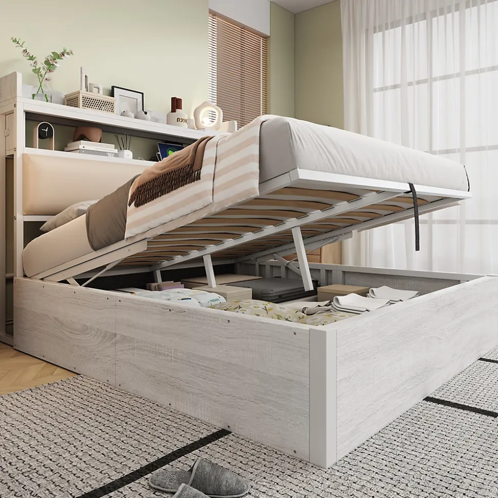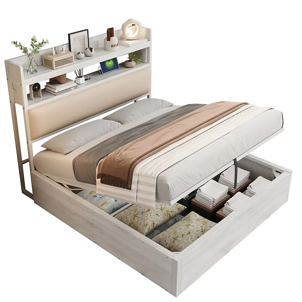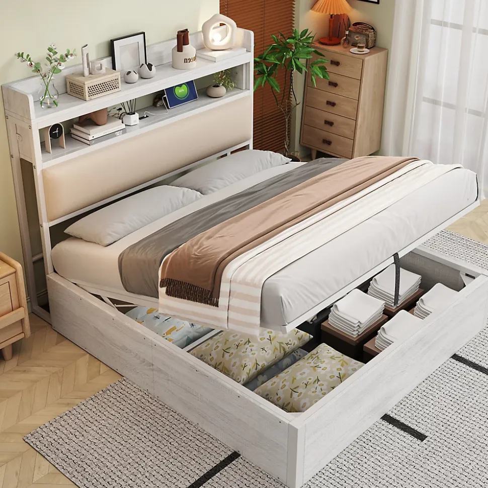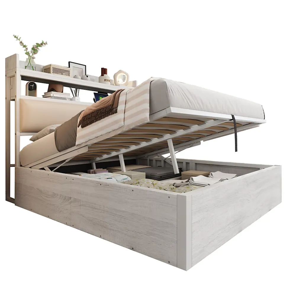 - Rangement volumineux accessible par système hydraulique silencieux, offrant un grand espace sous le sommier; tête de lit avec niche intégrée et ports USB pour garder l’essentiel à portée.