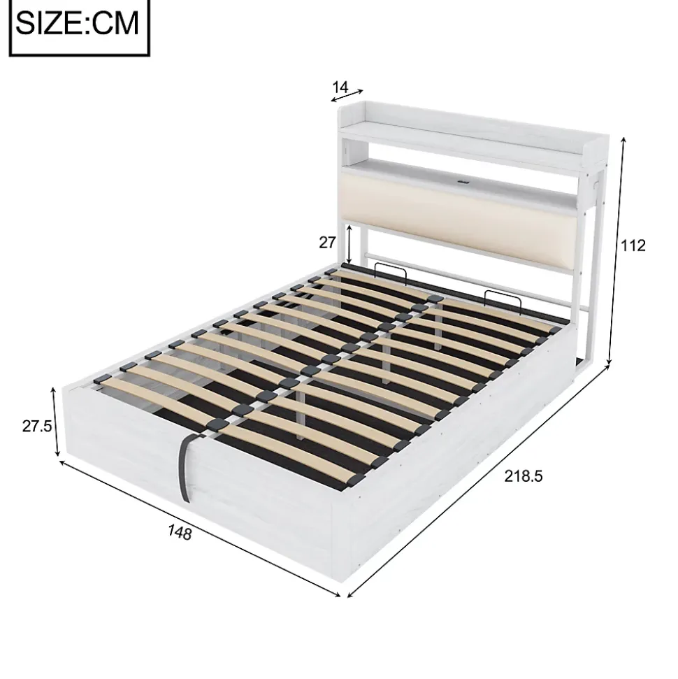 Design & styleCe lit 140×200 cm combine une esthétique vintage et une ligne contemporaine : panneaux imitation bois au grain patiné, cadre métal blanc et tête de lit rembourrée en tissu. L’ensemble crée une ambiance chaleureuse et sophistiquée, adaptée aux intérieurs modernes ou aux décors plus rustiques.Fonctionnalité & rangement Système de levage hydraulique pratique et silencieux pour un accès aisé à un vaste espace de rangement sous le sommier, idéal pour couettes, vêtements et articles saisonniers. Tête de lit avec compartiment intégré permettant de ranger livres et objets de chevet ainsi que ports USB intégrés des deux côtés pour recharger appareils mobiles sans multiplier les câbles. Dimensions produit complètes : 218,5 x 148 x 112 cm. Livré en 2 colis, capacité recommandée 200 kg et épaisseur de matelas préconisée 15–26 cm.Matériaux & confortStructure robuste en métal associée à éléments en MDF et tissu rembourré au niveau de la tête de lit. Le sommier intègre 28 lattes pour un soutien homogène et un usage sans grincement, offrant stabilité et durabilité au quotidien.Entretien & finitionFinitions blanc et bois faciles à entretenir : surfaces MDF et métal nettoyables avec un chiffon humide, tissu de la tête de lit à dépoussiérer régulièrement. Éviter produits abrasifs pour préserver l’aspect et la couleur.Installation & livraisonMontage complet requis ; deux personnes recommandées. Outils fournis (tournevis nécessaire), durée de montage estimée à environ 1 heure. Produit livré en deux colis pouvant arriver séparément. Matelas non inclus.