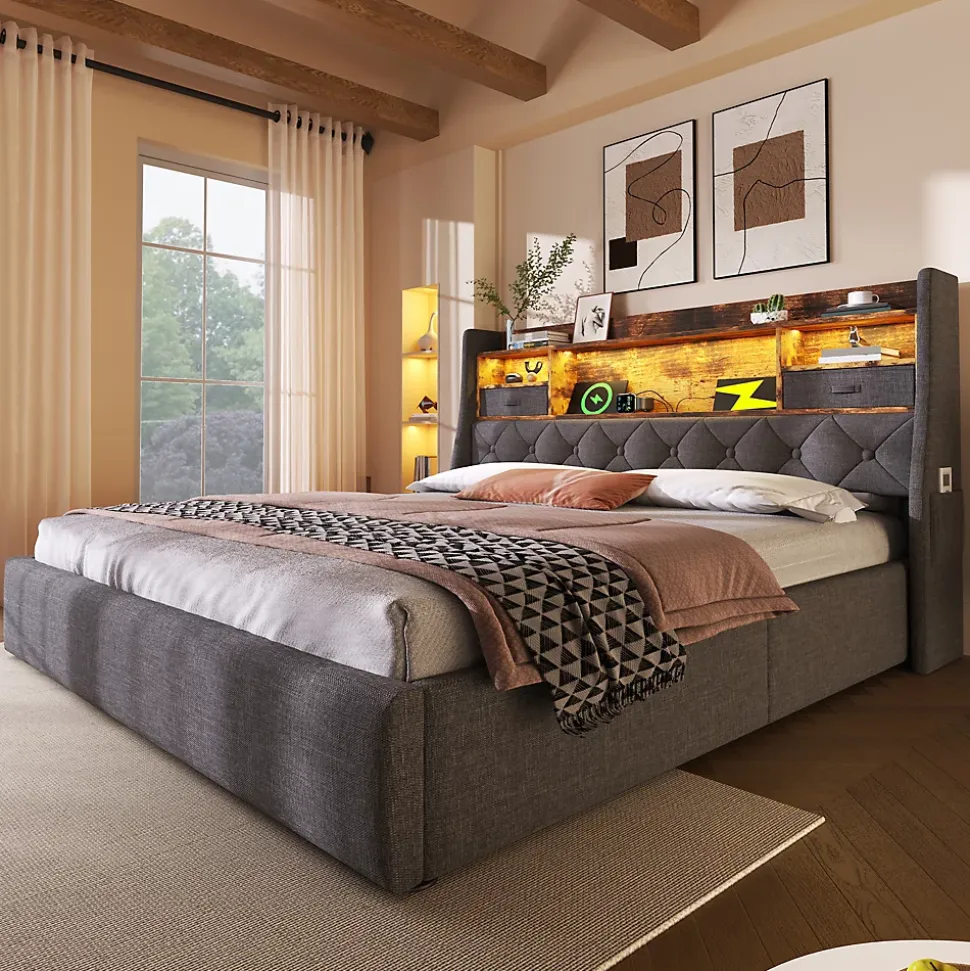 Design & styleCe lit associe un look rétro contemporain et des lignes larges et épurées : revêtement en tissu lin gris, dossier rembourré avec motifs losange et étagère intégrée au sommet de la tête de lit pour un rangement discret. Le rendu apporte une touche cosy et soignée à la chambre.Fonctionnalité & rangement Système hydraulique facilitant l’ouverture du sommier et l’accès au grand espace de rangement sous le lit, idéal pour couettes et housses. Éléments de rangement complémentaires : étagère de tête, tiroir en tissu et poches latérales pour téléphone, télécommande ou lectures. Tête de lit équipée d’un LED RGB contrôlable par application ou télécommande (plus de 60 000 couleurs) avec mode musique, et 4 ports de charge (3 USB dont 1 charge rapide et 1 Type‑C) pour plus de confort.Matelas inclusLe lit est livré avec un matelas 140x200x25 cm conçu pour un soutien zoné (7 zones) et une bonne aération. Confort ferme (H3) adapté aux dormeurs sur le côté, le dos ou le ventre ; housse en polyester, produit livré roulé.Matériaux & entretienStructure avec sommier à lattes massives et pieds métalliques assurant une tenue stable. Revêtement en lin gris agréable et pratique. Nettoyage recommandé : chiffon humide avec eau et savon doux, puis essuyer au sec.Installation & livraisonMontage requis ; deux personnes conseillées. Le produit est livré en 3 colis pouvant arriver séparément, notice et outils inclus. En cas de pièces manquantes, contactez le service client. Dimensions totales du produit monté : env. 221 x 152,5 x 116 cm.
