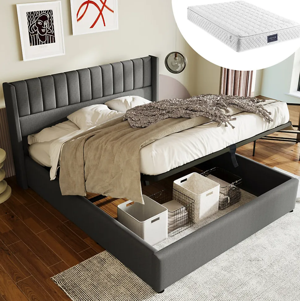 - Large coffre sous sommier relevable avec vérin hydraulique et sangle pour ouverture facile. Coffre pour la literie; cadre métal et pieds de soutien assurent la stabilité. Charge maxi 181 kg.