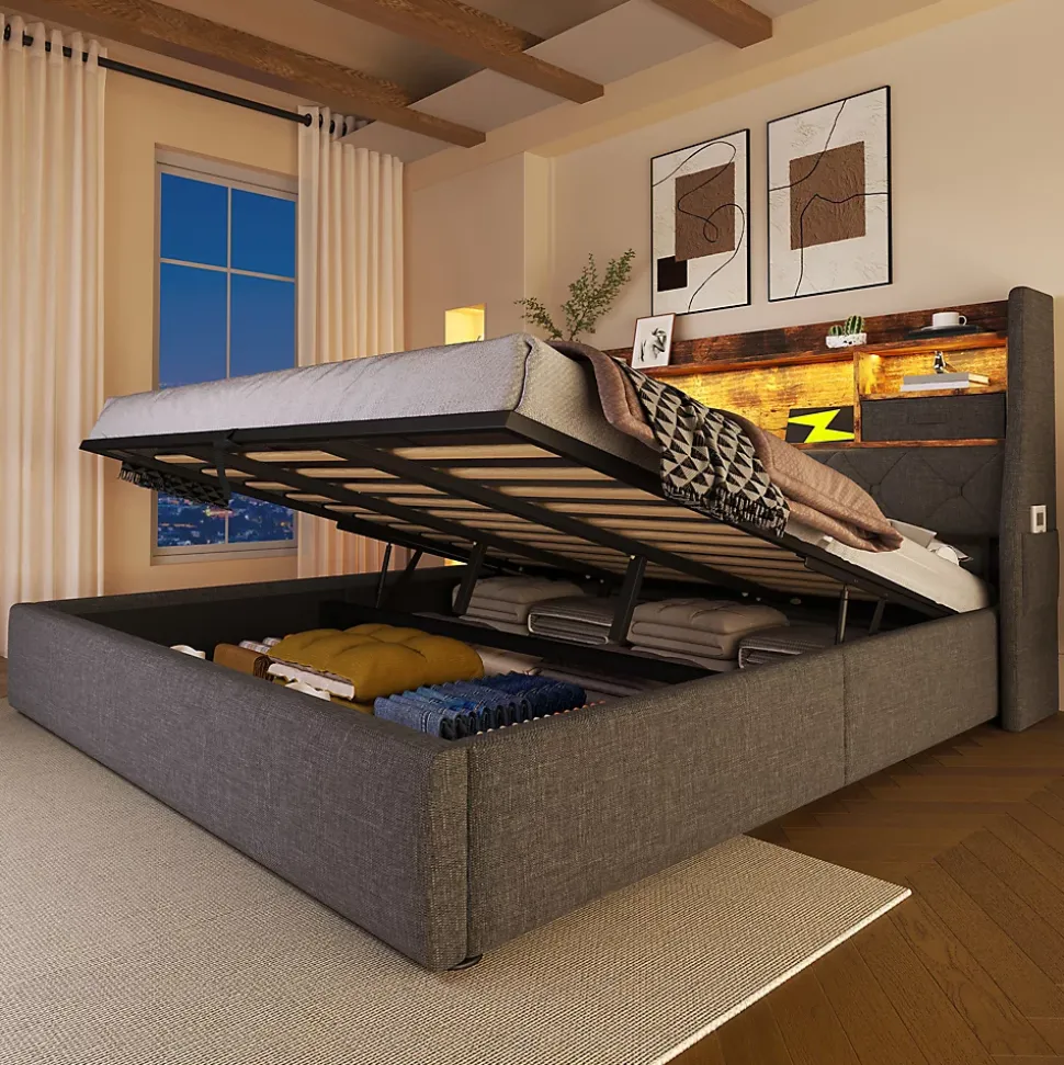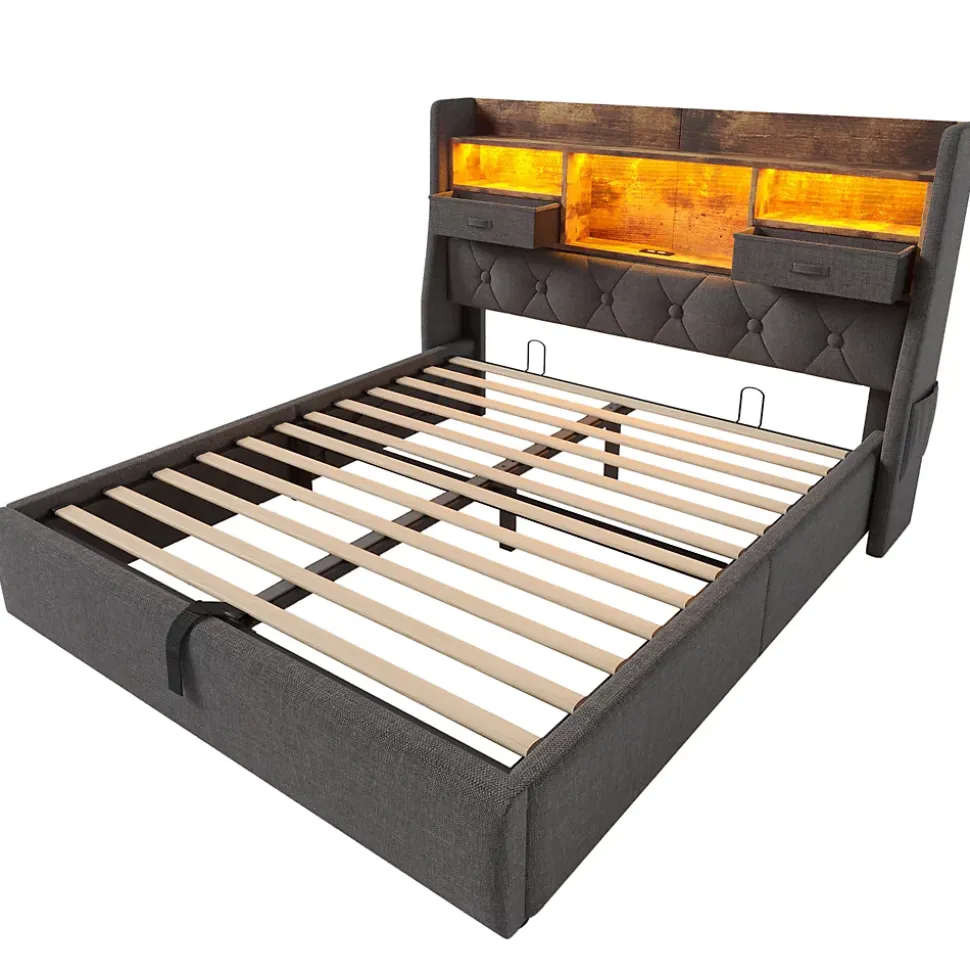 Design & styleCe lit 140×200 cm présente un style rétro élégant avec larges flancs courbés et dossier capitonné. La tête de lit intègre une étagère au ton chaleureux et un revêtement en tissu lin gris, conçu pour s’harmoniser avec de nombreux intérieurs. Dimensions totales du cadre : 221 x 152,5 x 116 cm.Fonctionnalité & rangement Mécanisme hydraulique pour un accès facile au grand coffre de rangement sous le sommier, sangles d’ouverture incluses. Rangements complémentaires : étagère de tête, tiroir en tissu et poches latérales pour smartphone, livres et accessoires. Sommier à lattes intégré et deux butées en U au niveau de la tête pour maintenir la matelas (matelas non fourni).Éclairage & connectivitéBandes led intégrées offrant plus de 60 000 couleurs, pilotables via application ou télécommande ; mode musique synchronisant l’éclairage au rythme. Tête de lit équipée de 3 ports USB (dont 1 charge rapide) et 1 port Type‑C pour recharger smartphones et tablettes.Matériaux & soliditéRevêtement en tissu lin gris, lattes massives et pieds métalliques assurent une bonne stabilité et une capacité d’usage durable. Structure renforcée et pièces de fixation prévues pour une pose sécurisée ; charge utilisateur maximale recommandée : 181 kg.Installation & livraisonMontage requis, deux personnes conseillées. Le produit est livré en 2 colis (possibilité d’arrivée séparée). Notice et outillage fournis dans l’emballage. En cas de pièces manquantes, contacter le service client. Entretien : nettoyer avec un chiffon humide et un détergent doux, puis essuyer à sec.