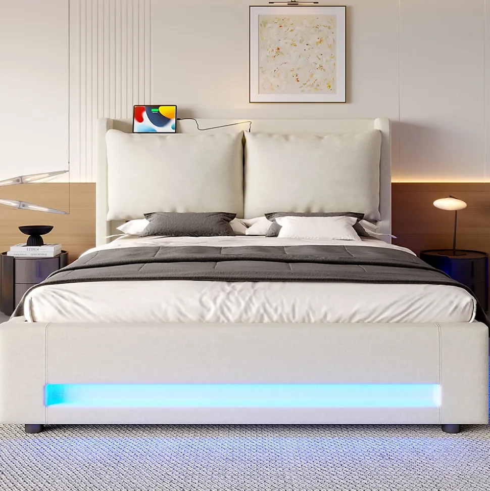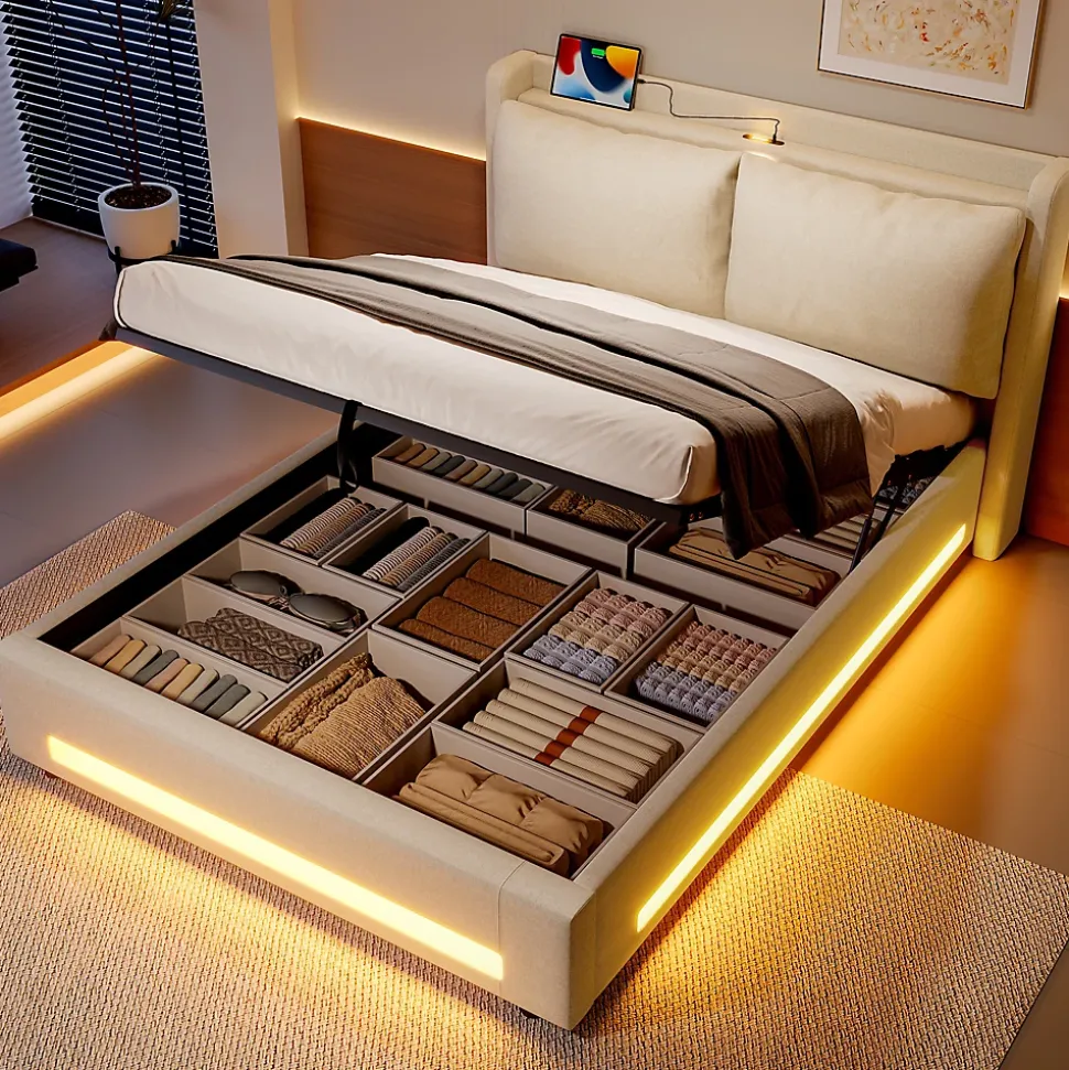 Design & styleCe lit 140×200 cm combine lignes contemporaines et matières naturelles. Le revêtement en lin beige apporte une sensation de confort et une esthétique chaleureuse, tandis que la tête de lit à étagère structure l’espace et garde l’essentiel à portée de main.Rangement hydraulique & éclairage Système hydraulique pour soulever facilement le sommier et accéder à un grand volume de rangement, idéal pour linge de lit et vêtements saisonniers. Bandes LED latérales intégrées créent une lumière d’ambiance pratique pour la lecture ou pour retrouver un éclairage doux le soir.Tête de lit multifonctionLa tête de lit intègre une niche de rangement, une petite veilleuse et une prise USB‑C pour recharger un téléphone sans sortir du lit. Le coussin amovible ajoute du confort lors de la lecture et se retire facilement pour le nettoyage.Matériaux & entretienStructure robuste, revêtement en lin respirant et douceur agréable au toucher. Le panneau inférieur est recouvert d’un tissu anti‑poussière pour protéger les objets stockés. Entretien simple : aspirateur doux ou chiffon légèrement humide selon les taches.Installation & livraisonMontage requis, deux personnes recommandées. Livré en 2 colis (dimensions totales produit 149x210x114 cm). Poids net 49,5 kg / brut 54,5 kg. Compatible avec matelas 20–25 cm. Sommier/boxspring requis selon configuration souhaitée.