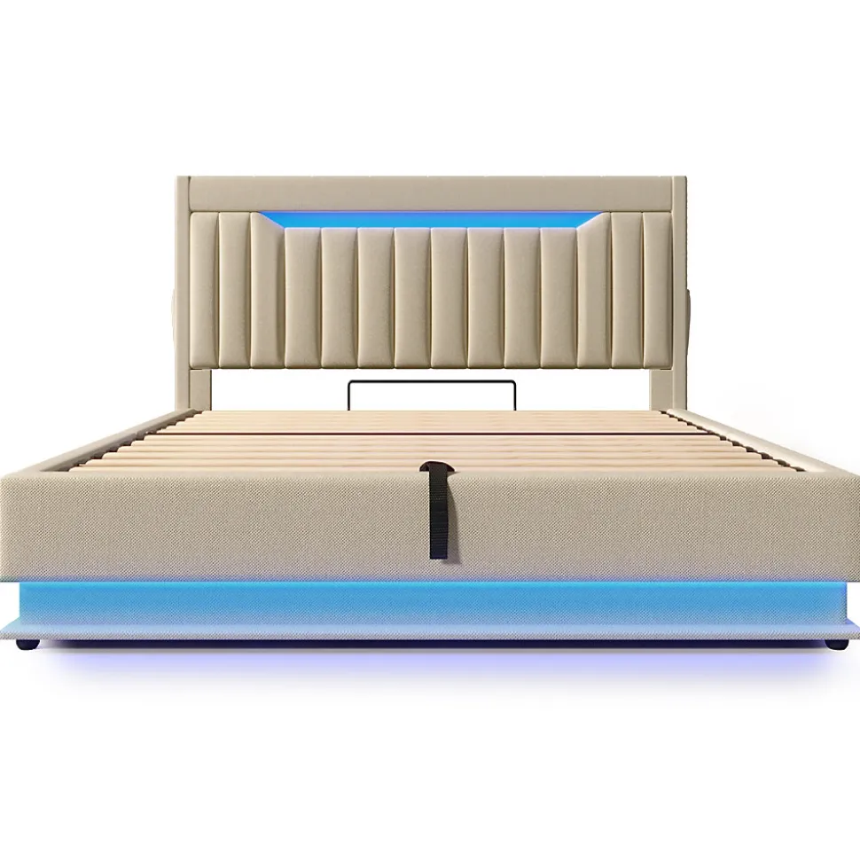 Design & styleCe lit 140×200 cm présente un revêtement en lin beige et une tête de lit à bandes verticales qui apporte une esthétique contemporaine et chaleureuse. Les bandes LED intégrées au niveau de la tête et du pied créent une ambiance modulable sans altérer l’apparence générale du mobilier. Dimensions totales du cadre : 142x218x112 cm (LxP xH). Matelas non fourni.Fonctionnalité & rangement Étagère pratique au-dessus de la tête pour poser téléphone, lampe ou objets du quotidien ; compartiments internes pour un rangement discret. Poches latérales pour accéder rapidement aux petits objets et grand coffre sous le sommier avec ouverture hydraulique pour un accès facile à la literie. Ports de charge intégrés : 3 ports USB et 1 port Type‑C (dont un port de charge rapide) pour recharger téléphones et tablettes au lit.Matériaux & structureStructure principale en métal avec lattes en bois pour une bonne tenue et une répartition homogène du soutien. Le revêtement est en tissu type lin couleur beige, facile à intégrer dans une décoration douce. Tous les points de contact du cadre sont équipés de pads EVA pour réduire les bruits. Charge maximale recommandée : 250 kg. Poids brut/net : 58,45 kg / 52 kg.Éclairage & connectivitéLes bandes LED sont pilotables via application mobile ou télécommande, avec programmation horaire, plus de 60 000 couleurs et modes dynamiques incluant la synchronisation sur la musique. Réglages simples pour intensité et effets lumineux. La prise intégrée au niveau de la tête facilite la recharge des appareils sans câble supplémentaire.Installation & livraisonMontage requis, pièces repérées et instructions fournies ; deux personnes recommandées pour l’assemblage. Produit livré en 2 colis pouvant arriver séparément. Matelas conseillé : 140×200 cm, épaisseur recommandée 27 cm. En cas de pièces manquantes à la livraison, contacter le service client.