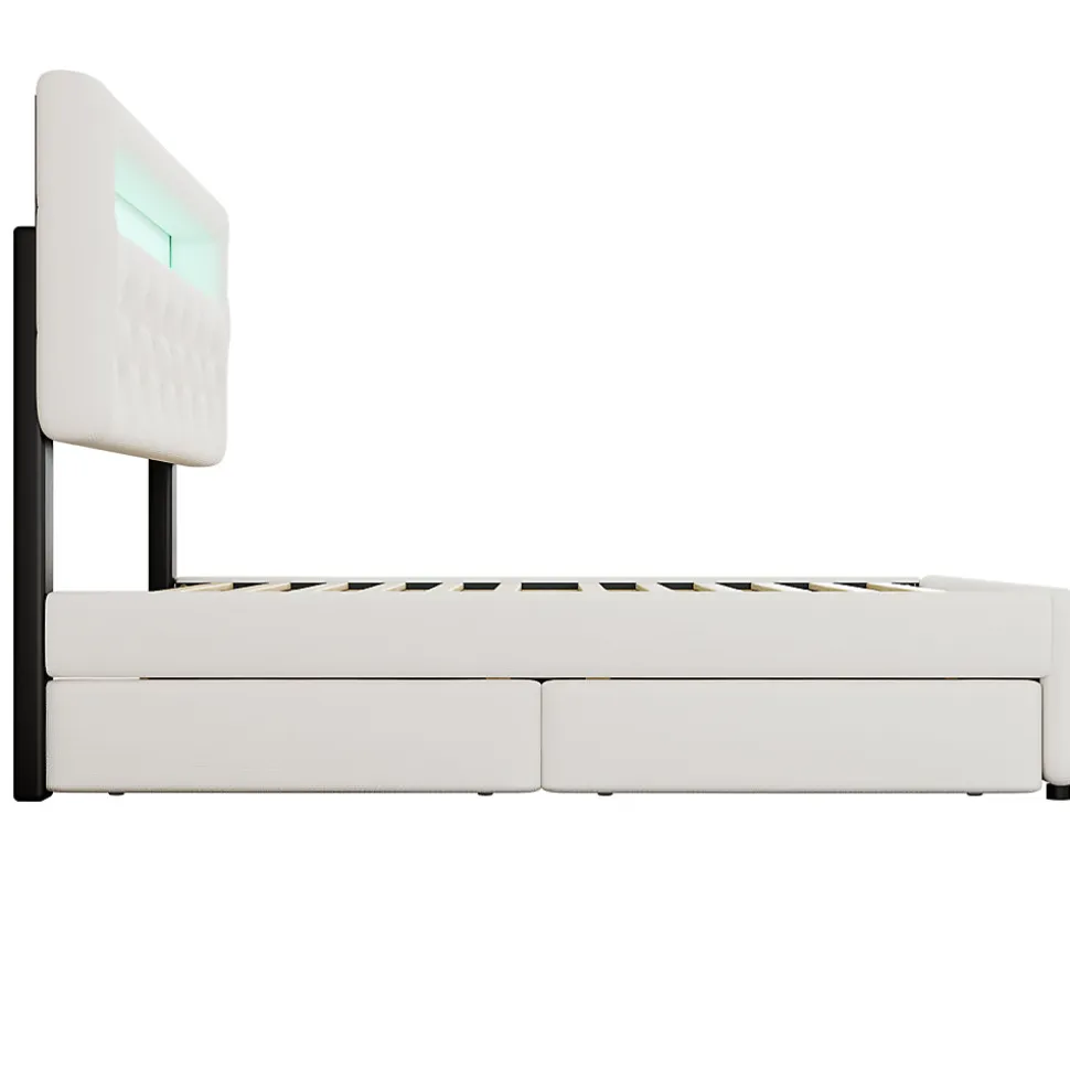 Design & styleCe lit tapissé associe une silhouette soignée et un revêtement en coton-lin blanc pour un rendu sobre et chaleureux. La tête et le pied ont été dessinés pour rester esthétiques dans le temps et s’intégrer à différents styles de décoration, du contemporain au scandinave.Fonctionnalité & rangement Deux tiroirs de grand volume placés sous le sommier permettent de ranger literie, vêtements et accessoires pour garder la chambre ordonnée. Lit gigogne intégré (dimensions 89×191 cm) pour accueillir un invité sans encombrer l’espace au quotidien. Table de chevet équipée d’une bande lumineuse apportant une ambiance douce et pratique pour la lecture.Matériaux, stabilité & dimensionsStructure en panneaux MDF et panneaux de particules, avec un cadre croisé métallique renforcé offrant un soutien solide jusqu’à 250 kg. L’ensemble comprend 12 lattes pour le lit principal et 10 lattes pour le couchage gigogne. Dimensions extérieures : 205x141x115 cm (hauteur tête 109/115 cm réglable). Dimensions intérieures du couchage principal : 140×200 cm ; couchage gigogne : 89×191 cm. Hauteur d’assise approximative : 33 cm. Épaisseur recommandée pour matelas principal : 15–20 cm ; pour le matelas du gigogne : 10 cm.Entretien & utilisationRevêtement en coton et lin agréable au toucher et résistant à l’usage quotidien. Nettoyer la surface avec un chiffon doux et sec ou légèrement humide ; éviter les produits abrasifs. Conception pensée pour un usage familial et une circulation aisée dans la chambre.Installation & emballageProduit livré en 2 colis depuis l’Allemagne, les colis peuvent arriver séparément. Montage requis, deux personnes recommandées pour assurer une installation sûre. Notice et quincaillerie fournies dans les colis.