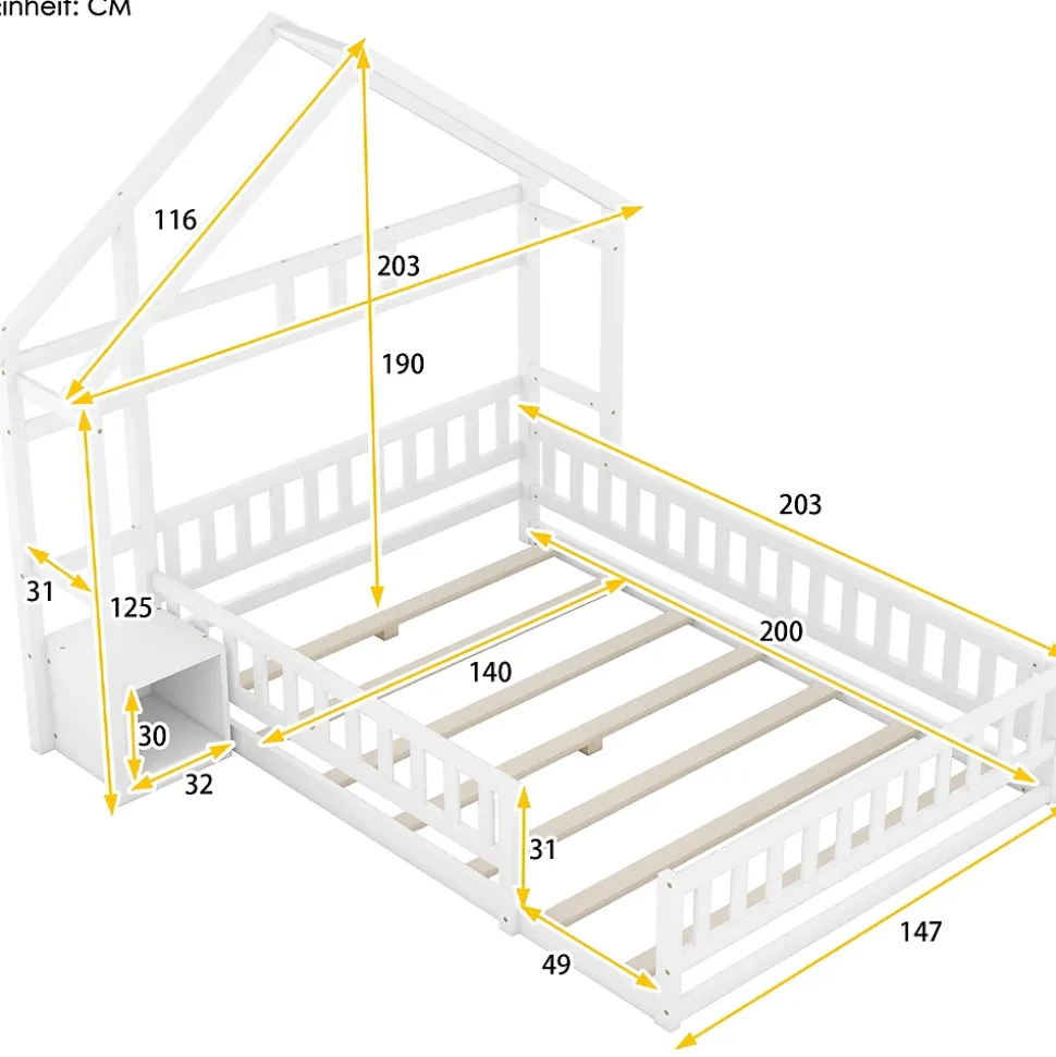 Design & styleCe lit en forme de maison apporte une atmosphère chaleureuse et ludique à la chambre d’un enfant. La finition blanche et les lignes épurées s’intègrent facilement dans un décor contemporain ou scandinave tout en offrant un point focal décoratif et sécurisant.Fonctionnalité & rangementTable de chevet intégrée pour garder livres et objets à portée de main.Barrière latérale de 31 cm empêchant les chutes et favorisant un sommeil serein.Sommier composé de 7 lattes adapté au couchage 140×200 cm (matelas conseillé 15–20 cm).Matériaux & entretienStructure en pin massif associée à éléments en MDF, finition peinte avec vernis. Bois robuste et durable conçu pour un usage quotidien ; entretien facile avec un chiffon doux et un produit adapté au bois peint.Dimensions & sécuritéDimensions totales : 203x203x190 cm ; intérieur couchage 140×200 cm. Capacité de charge : 250 kg. Conception stable et barrières sécurisées pour accompagner la croissance de l’enfant en toute sérénité.Installation & emballageProduit livré en 2 colis ; les colis peuvent arriver séparément. Montage requis, deux personnes recommandées pour un assemblage sûr. Tous les éléments et la notice sont fournis pour faciliter l’installation.