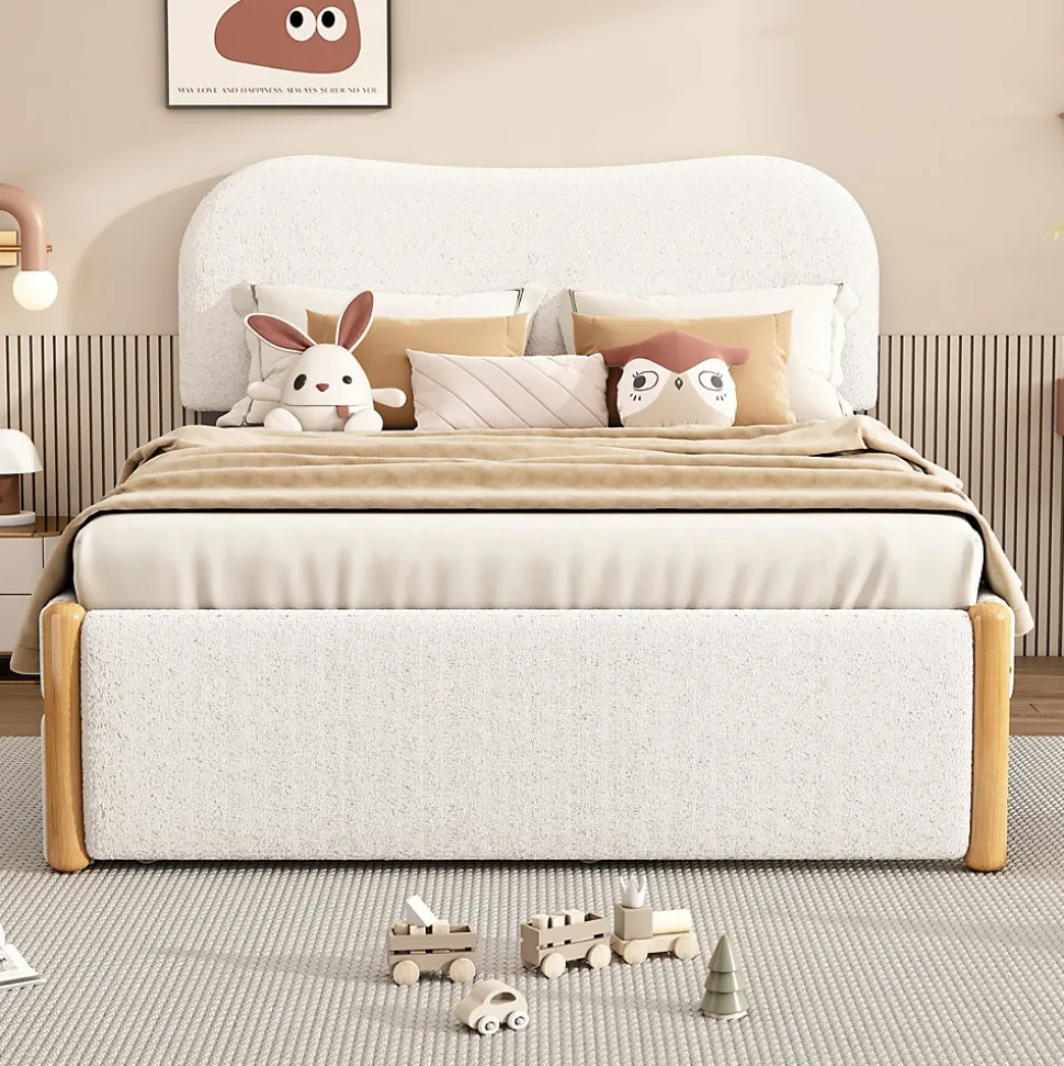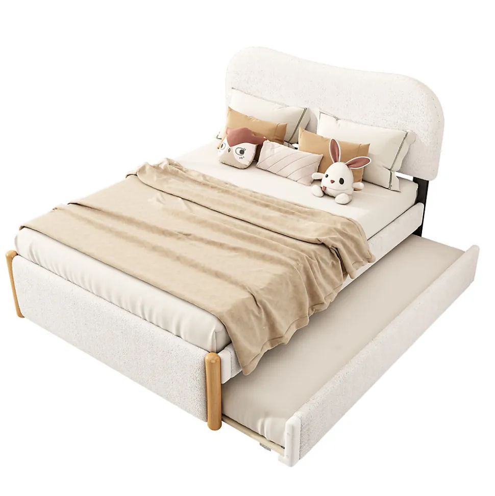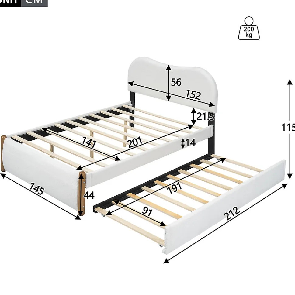 Design & styleCe lit tapissé associe un style minimaliste et des lignes épurées pour s’intégrer facilement aux intérieurs contemporains. La tête de lit en velours blanc, rehaussée d’un décor bois en bout de lit, apporte une note chaleureuse et discrète tout en conservant une esthétique sobre et accueillante.Fonctionnalité & rangement Lit principal adapté à un matelas 140×200 cm pour un couchage quotidien confortable. Lit gigogne rétractable (intérieur 91×191 cm) positionnable à gauche ou à droite selon les besoins, pratique pour recevoir un enfant ou un invité. Structure étudiée pour optimiser l’espace de la chambre sans surcharger le volume visuel.Matériaux & entretienStructure en panneaux MDF et revêtement en velours (plush) offrant un toucher doux et une bonne tenue. Hauteur totale 115 cm, cadre équipé de 10 lattes. Capacités : 200 kg pour le lit principal et 80 kg pour le gigogne. Pour l’entretien, dépoussiérer régulièrement et nettoyer avec un chiffon doux humide si nécessaire.Installation & emballageMontage requis, notice et pièces complètes fournies, deux personnes recommandées pour l’assemblage. Livré en 2 colis depuis l’usine (Vietnam) ; les colis peuvent arriver à des dates différentes. Dimensions utiles et recommandations : intérieur lit 140×200 cm, gigogne 91×191 cm, recommandé pour matelas de 15-20 cm d’épaisseur.