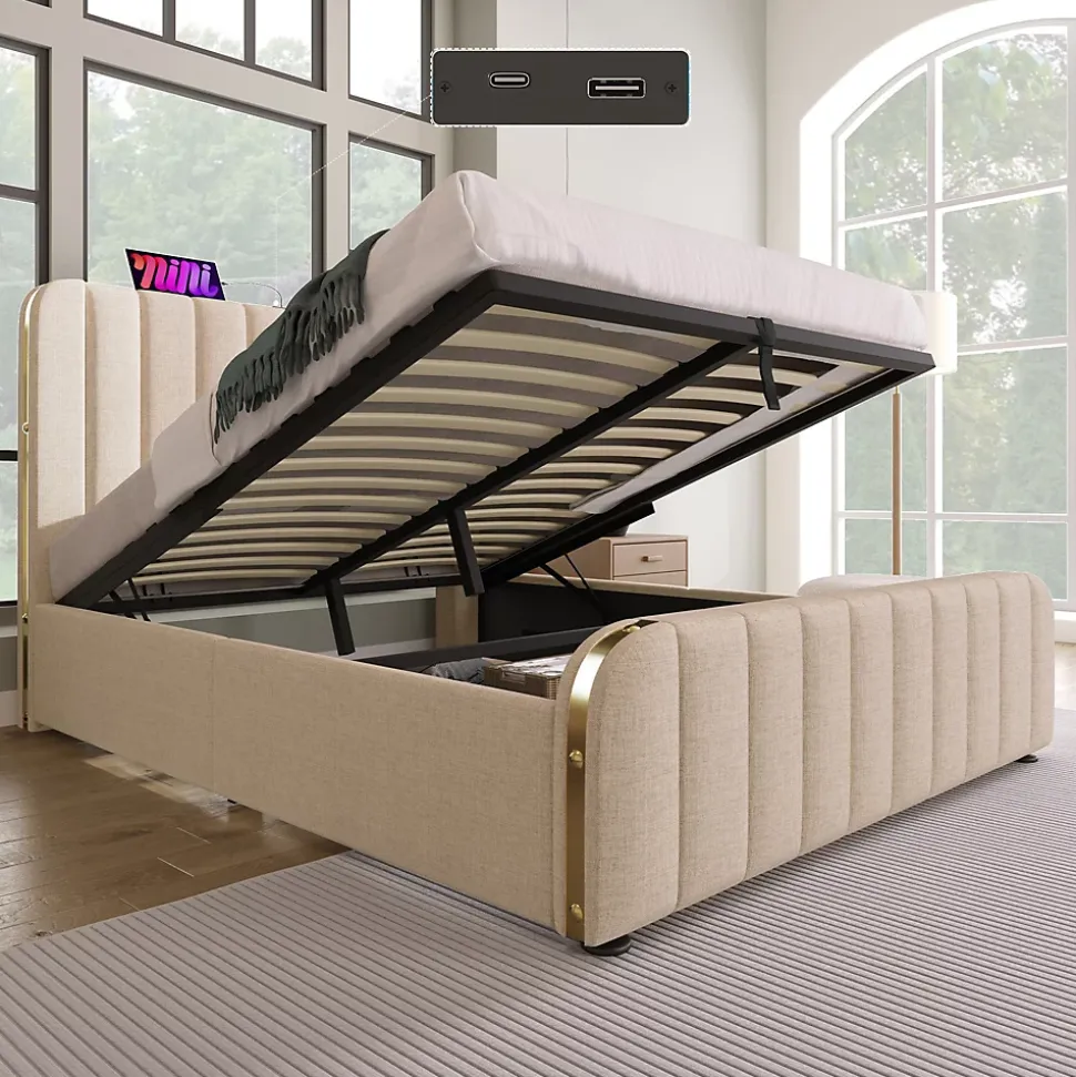 Design & styleCe lit 140×200 cm tapissé en tissu lin beige allie une esthétique contemporaine à des détails soignés : bandes métalliques dorées encastrées et rivets décoratifs sur la tête et les panneaux latéraux. Le contraste entre le métal et le textile crée une silhouette raffinée, tandis que la tête de lit au profil non rectangulaire limite les risques de chocs et offre un appui confortable pour la lecture ou la détente.Fonctionnalité & rangement Système de relevage hydraulique de qualité pour accéder facilement à un grand volume de rangement sous le sommier, idéal pour valises, linge de maison et articles hors saison. Deux butées au niveau de la tête empêchent le glissement du matelas et facilitent son emplacement. Port central USB et USB‑C intégré dans la tête de lit pour recharger vos appareils sans quitter le lit.Matériaux & confortStructure en métal laqué haute résistance associée à des lattes en bois massif pour un soutien homogène et une capacité d’utilisation jusqu’à 181 kg. Bandes EVA anti‑bruit intégrées pour réduire les frottements et favoriser un sommeil plus silencieux. Le tissu lin est testé selon le standard Oeko‑Tex, non allergène et agréable au toucher. Conçu pour accueillir un matelas 140×200 cm (matelas non inclus).Entretien & qualitéFinitions faciles à entretenir : dépoussiérage régulier ou nettoyage ponctuel avec un chiffon doux humide pour préserver l’aspect du lin ; parties métalliques à essuyer avec un chiffon sec. Conception robuste pensée pour un usage quotidien dans un cadre domestique.Installation & livraisonMontage requis, deux personnes recommandées. Le produit est expédié en 3 colis pouvant arriver séparément ; vérifiez la réception complète des éléments. Poids brut/net indicatif 49,7/43,6 kg. Dimensions totales approximatives après montage : 216x150x101 cm. Contenu : cadre de lit et sommier à lattes. En cas de pièces manquantes, merci de contacter le service client.