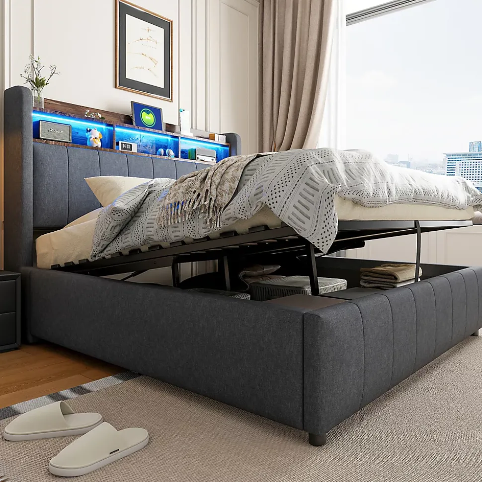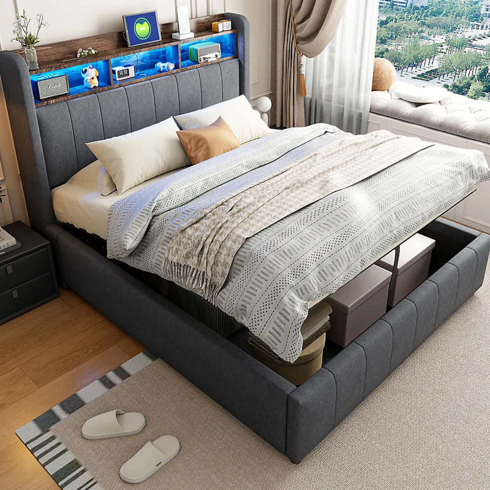 Design & styleCe lit 140 x 200 cm tapissé en tissu lin gris associe esthétique contemporaine et fonctionnalité. La tête de lit est dotée d’étagères discrètes et d’un éclairage LED changeant, permettant d’ajuster l’ambiance selon vos envies et de valoriser la décoration de la chambre.Fonctionnalité & rangement Mécanisme hydraulique pour accéder facilement au coffre de rangement sous le sommier, idéal pour ranger couettes, oreillers et linge saisonnier. Rangements intégrés dans la tête de lit pour livres et petits objets, avec ports USB et Type‑C pour recharger rapidement smartphone et tablette au lit. Large ouverture et accès pratique pour une organisation quotidienne simplifiée.Matériaux & caractéristiques techniques Revêtement : tissu lin gris, résistant aux usages quotidiens et facile d’entretien. Structure : cadre et renforts métalliques, panneaux en MDF/contreplaqué pour une bonne stabilité. 24 lattes de support, capacité de charge recommandée 250 kg, épaisseur matelas conseillée 24–26 cm. Dimensions totales produit : 212,5 x 140 x 111 cm (long. x larg. x haut.). Nombre de colis : 2. Poids total colis : env. 47,85 kg.Installation & entretienMontage complet requis, deux personnes recommandées ; outils inclus (éviter l’usage d’outils électroportatifs). Prévoir environ 2 heures pour l’assemblage. Entretenir le tissu avec un chiffon doux et un nettoyage ponctuel sans produits agressifs pour préserver l’aspect et la couleur.Livraison & emballageProduit livré en plusieurs colis pouvant arriver séparément. Vérifier l’état des paquets à la réception et conserver les emballages jusqu’au montage pour faciliter un éventuel retour ou contrôle.