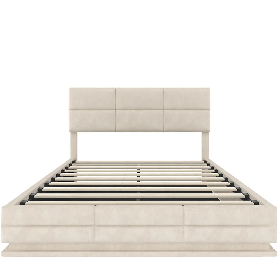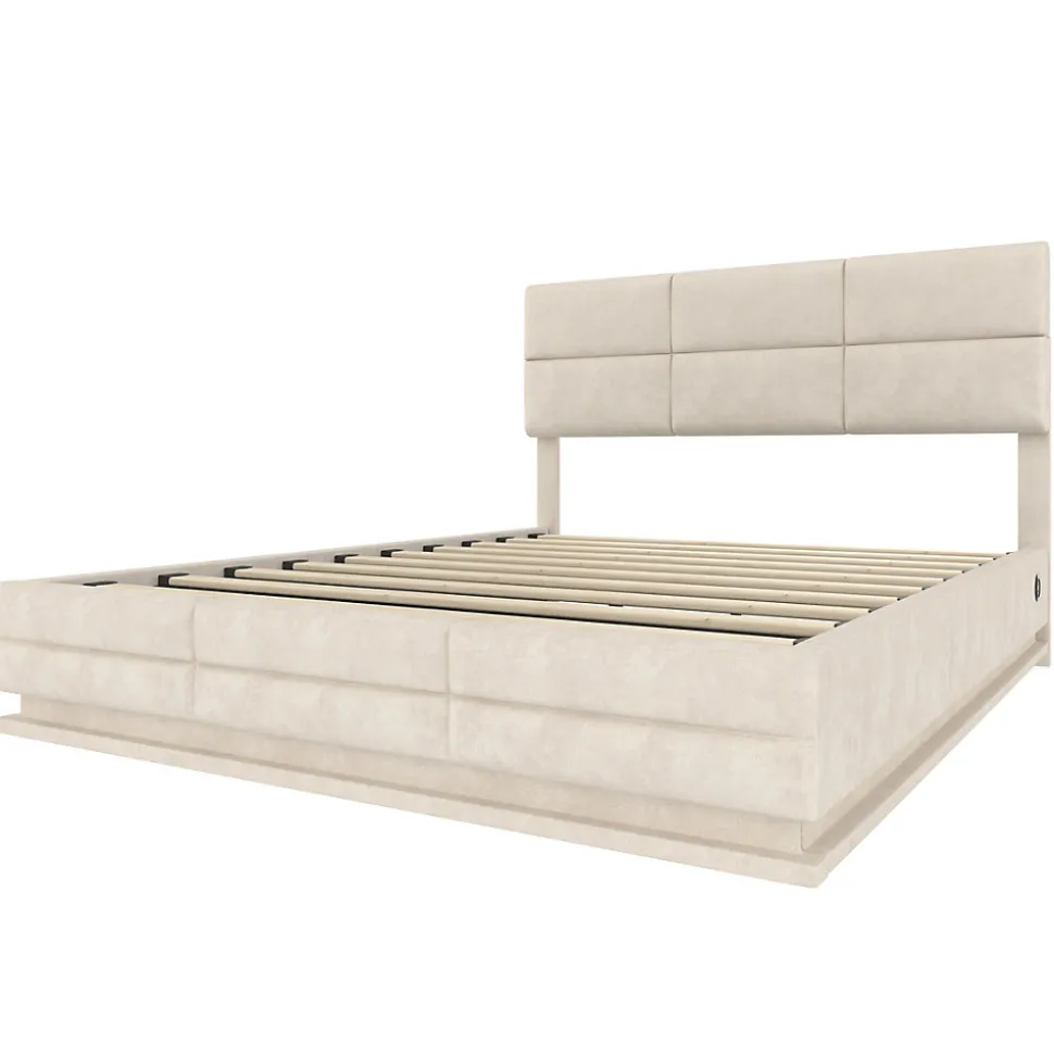 Design & styleCe lit 140×200 cm tapissé en velours beige apporte une allure contemporaine et chaleureuse à la chambre. La finition douce et texturée confère une sensation agréable au toucher et s’intègre naturellement aux décors minimalistes, scandinaves ou industriels sans alourdir l’espace.Fonctionnalité & rangement Coffre de rangement XXL sous le sommier, optimisant l’espace de la pièce et permettant de stocker linge de lit, oreillers et vêtements saisonniers. Système hydraulique silencieux pour une ouverture et une fermeture aisées et sécurisées, sans effort ni bruit excessif. Ports de charge intégrés (USB) sur les côtés du cadre pour garder vos appareils accessibles et organisés pendant la nuit.Tête de lit & éclairageTête de lit réglable en trois positions pour adapter l’inclinaison à la lecture, au confort devant la télévision ou au repos. Éclairage LED d’ambiance dimmable avec réglage de la température de couleur pour créer une atmosphère plus chaude ou plus neutre selon le moment de la journée.Matériaux & entretienStructure tapissée en velours beige, résistante et facile à entretenir : dépoussiérage régulier et nettoyage ponctuel à l’aide d’un chiffon doux. Conçu pour accueillir une épaisseur de matelas de 25–30 cm (matelas non fourni). Charge maximale recommandée : 250 kg.Spécifications techniquesDimensions extérieures approximatives : 142 x 206 cm. Hauteur de la tête de lit réglable entre environ 105 et 115 cm selon la position choisie. Poids net/brut approximatif : 47 / 52,1 kg. Quantité de colis : 2.Installation & livraisonMontage requis, deux personnes recommandées pour un assemblage sûr et efficace. Produit livré en deux colis pouvant arriver séparément ; notice incluse pour guider les étapes de montage et l’utilisation du système hydraulique et des réglages LED.