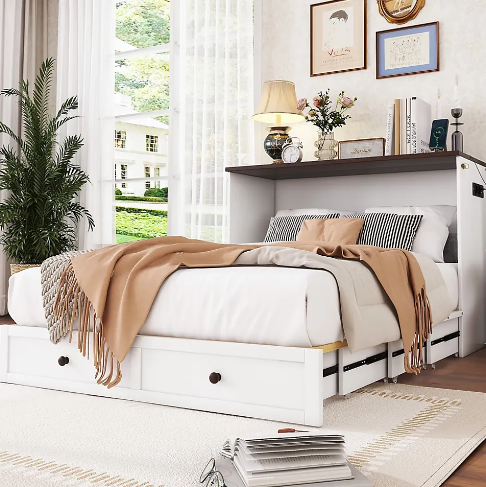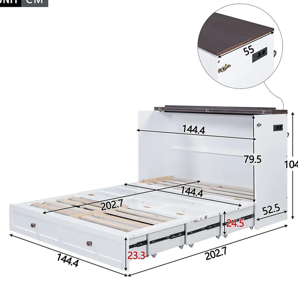 Design & styleCe lit mobile associe une esthétique sobre et une conception pratique : structure en pin sélectionné et panneaux MDF laqués blanc pour un rendu lumineux et homogène. La silhouette épurée et la tête transformable en étagère optimisent l’usage de l’espace tout en conservant une apparence contemporaine et discrète.Fonctionnalité & rangement Tiroirs de grande capacité sous le cadre pour ranger couettes, draps et accessoires et libérer l’espace au sol. Tête de lit astucieuse se transformant en étagère pour livres et objets du quotidien, maximisant chaque centimètre utile. Prises intégrées et port USB pour recharger téléphone et tablette à proximité du couchage sans contrainte.Matériaux, dimensions & entretienStructure robuste en pin et panneaux MDF, finitions résistantes faciles à entretenir à l’aide d’un chiffon doux. Dimensions extérieures approximatives : 202,7 x 144,4 x 104 cm. Intérieur de couchage : 140 x 200 cm (sans matelas). Charge maximale recommandée : 204 kg. Épaisseur de matelas conseillée : 15-20 cm. Produit vendu sans matelas.Installation & livraisonMontage requis, deux personnes recommandées pour sécuriser l’assemblage et garantir la stabilité. Le produit est livré en 3 colis qui peuvent arriver à des dates différentes ; prévoir un certain délai entre les colis. Conserver la patience lors de la réception et suivre les instructions de montage fournies.