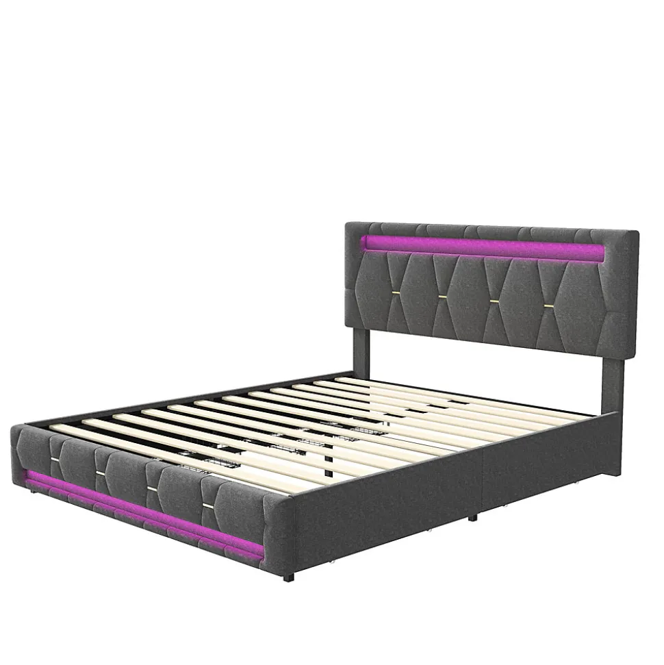 CaractéristiquesApparence éléganteAvec les tissus en lin et les surpiqûres, ce lit adulte 140×200 c/160×200 cm possède une apparence spéciale et élégante, il s’adapte parfaitement à votre chambre à coucher ou chambre d’ami.Eclairage LEDL’éclairage LED ajoute également un style moderne à votre chambre, avec la télécommande, vous pouvez changer les couleurs selon vos souhaits. Espaces de rangement et roulettes des tiroirsLes quatre tiroirs situés au bas du lit permettent de gagner de la place et peuvent être utilisés pour ranger des objets d’usage quotidien. Grâce aux roulettes, ces tiroirs pouvent être poussés et tirés facilement.Tête de lit réglable en hauteurLa tête de lit de ce produit peut être réglée de 10 cm vers le haut et vers le bas, ce qui s’adapte à tous les tailles d’utilisateurs. De plus, la tête de lit rembourrée est très doux et agréable, vous pouvez y vous adosser confortablement pendant la lecture ou la télévision.Sommier à lattes stableAvec des pieds centraux, le sommier à lattes possède une construction robuste et stable. Le lit est donc capable de résister à l’épreuve du temps. Spécifications- Hauteur du pied de lit : 29 cm- Matériaux du produit : Lin + Métal + Bois- Poids du produit : 35 kg- Capacité de charge : 250 kg- Montage requis : oui- Nombre de colis : 2 Remarques- Ce produit est divisé en 2 colis pour la livraison. Il se peut qu’ils n’arrivent pas en même temps. Merci d’attendre patiemment.- La livraison comprend un cadre de lit et un sommier à lattes. Le matelas n’est pas compris dans la livraison.- Si vous avez des questions pendant l’installation, veuillez nous contacter dès que possible.