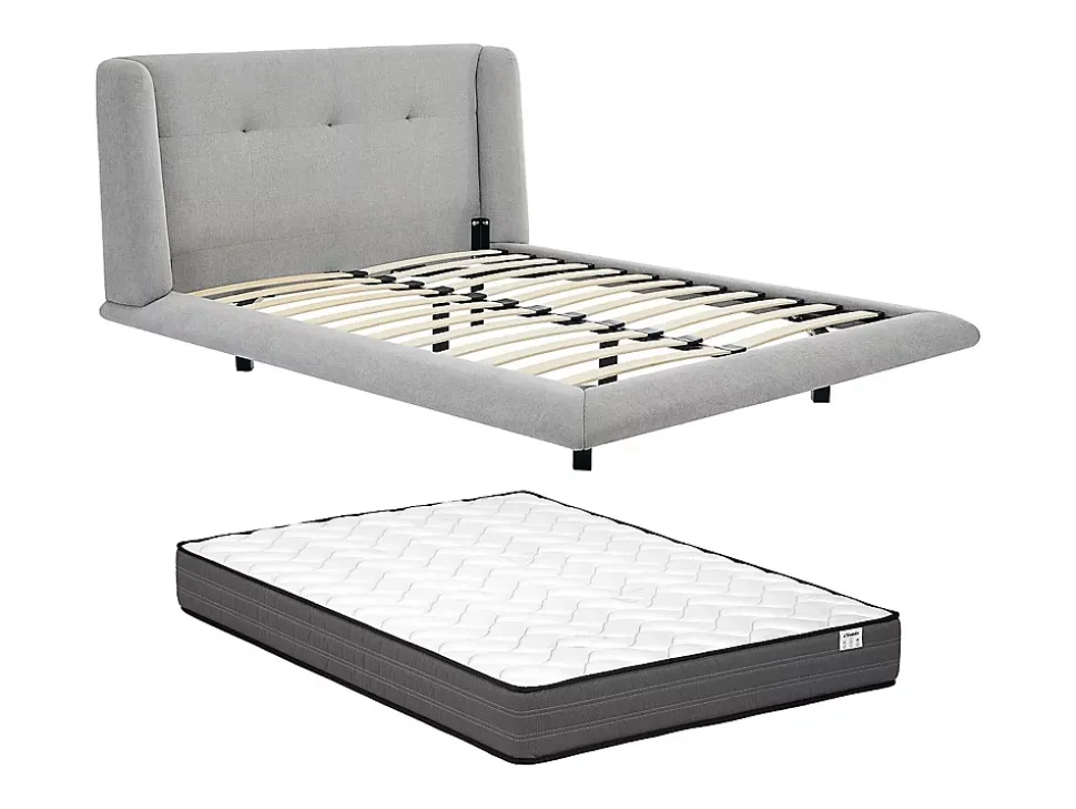 Avec son design épuré et chaleureux, le lit PENAVI sera un véritable atout si vous cherchez de quoi illuminer votre chambre à coucher. Il saura s’adapter à votre intérieur et vous apporter tout le confort nécessaire. 1 x Cadre de lit PENAVICaractéristiques Couleur (nuance) : Gris clair Matière (précision) : 100 % Polyester Matière (Piètement) : Métal Structure : Contreplaqué Finition : Capitonné Taille (couchage) : 160 x 200 cm Nombre de places : 2 places Garnissage : Mousse polyuréthane Densité (garnissage) : 25 kg/m³ Avec sommier Type de sommier : Cadre à lattes Nombre de lattes : 26 lattes Matière des lattes : Bois (peuplier) Charge maximale supportée : 500 kg À monter soi-même : Ce lit est compatible avec tous les matelas 160 x 200 cmDimensions Longueur : 196 cm Hauteur : 103 cm Profondeur : 229 cm Hauteur de couchage : 27 cm Hauteur des pieds : 21 cm Tête de lit : L196 x P12 x H103 cm1 x Matelas classique AMBRACIECaractéristiques Technologie (âme) : Ressorts ensachés Nombre de ressorts (matelas) : 580 Soutien : Equilibré Technologie matelas (accueil) : Mousse de confort Densité (accueil) : 23 kg/m³ Accueil : Tonique Garnissage du matelas : Fibres de polyester Coutil (matière) : Coutil stretch Couleur (nuance) : Blanc Matière (précision) : 100 % Polyester Taille (couchage) : 160 x 200 cm Nombre de places : 2 places Indépendance de couchage : Indépendance de couchage Réversible été/hiver, Carénage Gamme : Good for Planet Produit : Fabriqué en Europe Compressé/roulé : Compressé/rouléDimensions Longueur : 200 cm Hauteur : 20 cm Profondeur : 160 cm Epaisseur matelas : 20 cm Hauteur de l’âme : 15 cmLivraisonLors de la livraison, il est conseillé de vérifier que le bon nombre de colis a été livré.Colis1 x Cadre de lit PENAVIColis n°1 : Longueur 190 cm, Largeur 89 cm, Hauteur 15 cm, Poids 23 kg, Colis n°2 : Longueur 239 cm, Largeur 31 cm, Hauteur 21 cm, Poids 31 kg, Colis n°3 : Longueur 96 cm, Largeur 37 cm, Hauteur 31 cm, Poids 19 kg, 1