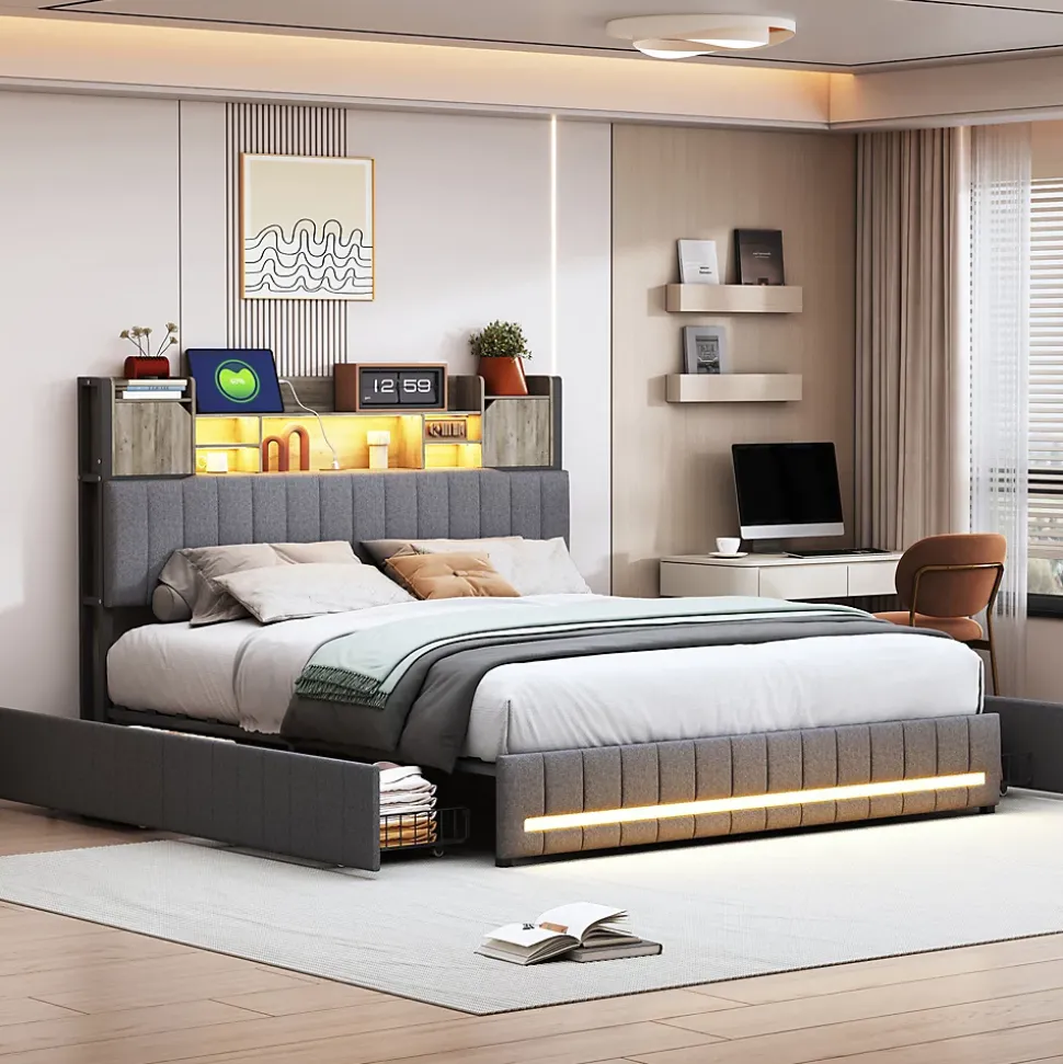 Tête de lit avec ports USB : l’une des caractéristiques les plus pratiques est la prise intégrée à la tête du lit, avec laquelle vous pouvez charger votre téléphone portable et votre tablette avant d’aller vous coucher. Éclairage LED : l’éclairage LED ajoute un style moderne à votre chambre à coucher, avec la télécommande, vous pouvez changer les différentes couleurs et luminosités pour vous allonger confortablement.Design de rangement : le lit est équipé de 4 tiroirs de grande capacité. Les deux côtés du lit sont équipés de boucles de tiroir qui permettent de fixer fermement le tiroir au lit lorsque le tiroir n’est pas utilisé pour que votre chambre soit bien rangée. Les boîtes de rangement se déroulent et se déroulent facilement grâce aux roulettes au sol.Pratique et design : le lit allie habilement design élégant et confort optimal. La structure du lit est principalement en fer, durable et a une capacité de charge allant jusqu’à 600 lbs. Les pieds de support supplémentaires de la barre centrale peuvent assurer la stabilité fiable du lit.Rangement sur la tête de lit : il s’agit d’un nouveau lit rembourré qui combine deux fonctions : décoration et rangement LED. L’espace de rangement sur le lit est divisé en une zone interne et une zone externe, avec 10 compartiments externes de différentes capacités pour les besoins quotidiens. La partie rembourrée au milieu du lit peut être ouverte pour ranger des objets plus grands.Détails du produit :Dimensions totales : 165 x 217.5 x 126 cm (l x l x H).Matériau du panneau : matériau de linCouleur : grisMax. Poids de l’utilisateur: 300kgType de charge : 2 USBBoxspring requis : aucun.Montage requis: OuiContenu de la livraison : structure de lit + USB + tiroirs.Design unique : USB + tiroirsMatelas applicable (matelas non inclus) : 160 x 200 cmQuantité du colis : 2.