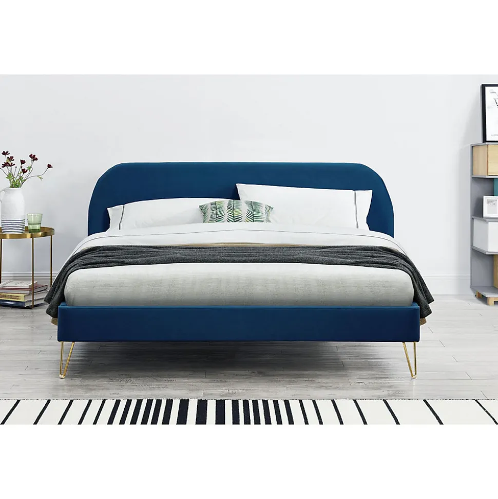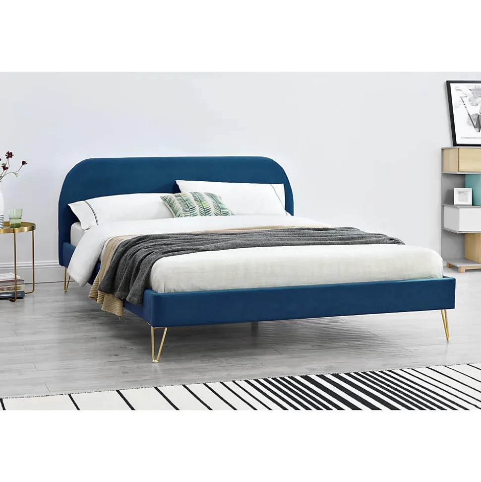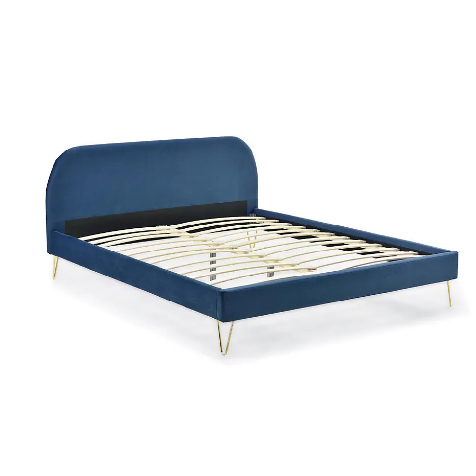 Lit 160×200 velours bleu et pieds epingles laitonAjoutez du style à votre chambre avec ce lit Queen size en velours bleu ! Ses pieds couleur laiton lui donne un cote retro-industriel qui vous permettra de l’assortir à votre decoration. Ses jolies formes arrondies lui donnent un certain charme.Le pietement en epingle, ne en 1941, permet de limiter la quantite de materiau tout en garantissant une parfaite solidite. Veritable icône du style Mid-Century, ce type de pietement revient au top de la tendance avec l’engouement du vintage !Caractéristiques techniques :Couleur lit : Bleu fonceCouleur pieds : LaitonStructure : PlywoodPieds : 4 pieds en metal doreRevêtement : VeloursDensite : 280g/m²Matières : Polyurethane, Plywood, MDF, MousseRangement : NonPoids maximum supporte : 180 kgLED : NonEntretien : Pour bien entretenir votre lit, utilisez un chiffon doux legèrement humide. N’utilisez pas de solvant.Dimensions :Structure de lit : 213 x 173 x 89 cm / 35,5 kgTaille du couchage : 160 x 200 cmDiagonale du couchage : 256 cmHauteur des pieds : 18 cmDimensions tête de lit : 153 x 7 x 89 cmNombre de latte : 24Poids des lattes : 5,5 kgConditionnement : Livre non monte, conditionne dans 2 cartons. Notice de montage incluse.Colis 1 : 178 x 8 x 72,5 / 14,5 kgColis 2 : 232 x 22 x 18 / 26,5 kg