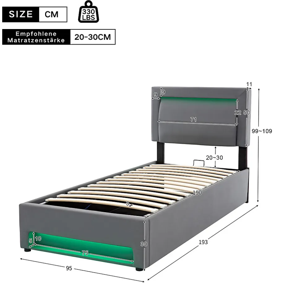 Design & style Ce lit tapissé en PU gris présente un motif litchi discret et des lignes contemporaines pour s’intégrer dans une chambre moderne. Dimensions compactes 160×190 cm, vendu sans matelas afin de laisser le choix du confort selon vos besoins.Éclairage & connectique Équipé d’un éclairage LED multicolore commandé par télécommande offrant plusieurs ambiances de lumière. Ports USB escamotables dotés d’un mécanisme à pression : en position relevée ils permettent la charge filaire, en position rentrée la surface accepte la charge sans fil pour les appareils compatibles.Fonctionnalité & rangement Le lit dispose d’un espace de rangement sous la structure pour linge de lit et accessoires, facilitant l’organisation de la chambre. Conception pratique pensée pour optimiser l’espace tout en conservant un accès simple aux solutions de charge et à l’éclairage.Structure & matériaux Cadre tapissé en PU avec sommier à lattes larges de 5 cm offrant un soutien homogène et une répartition régulière du poids. Charge maximale recommandée 150 kg. Poids net du produit 36 kg. Matériaux sélectionnés pour un aspect soigné et un entretien facile.Installation & livraison Montage requis, deux personnes recommandées ; outillage minimal nécessaire. Produit livré en 2 colis, instructions incluses. Entretien simple : surfaces PU nettoyables avec un chiffon doux et un détergent doux si besoin. Épaisseur de matelas recommandée 20–30 cm pour un confort optimal.