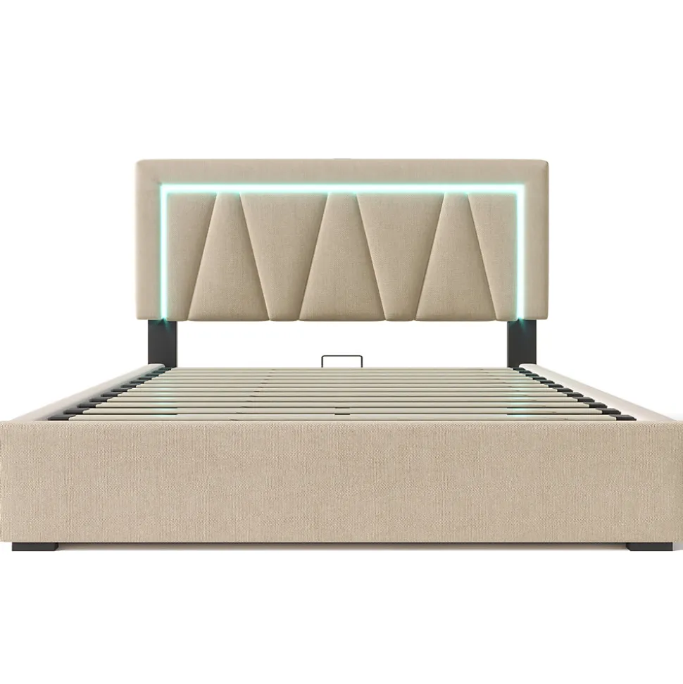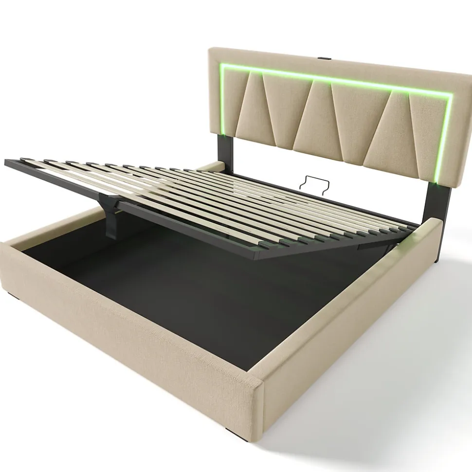 Design & styleLit 160 x 200 cm au style contemporain avec tête de lit géométrique rembourrée et boutons décoratifs. Revêtement en lin beige pour une apparence douce et naturelle, associé à un cadre métallique assurant une silhouette épurée et durable.Fonctionnalité & rangement Sommier relevable assisté par vérins à gaz offrant un grand coffre de rangement sous la zone de couchage, idéal pour housses, couettes et accessoires. Compatibilité matelas : 160 x 200 cm, épaisseur recommandée 12–32 cm pour un maintien optimal. Structure renforcée avec pied central de soutien pour une stabilité quotidienne et une capacité utilisateur jusqu’à 360 kg.Éclairage & connectivitéÉclairage LED intégré à la tête de lit, réglable par télécommande (choix de couleurs, intensité et mode). Base de recharge pratique avec ports USB et Type‑C intégrés pour recharger téléphone et tablette à proximité du lit.Matériaux, confort & hygièneRevêtement en tissu lin; textiles testés Öko‑Tex Standard 100. Le descriptif technique du matelas compatible indique un noyau 7 zones ventilé, housse 100% polyester et un garnissage combinant mousse et ressorts (720 ressorts pour certains modèles). Adapté aux personnes sensibles grâce à des matériaux non allergènes et une bonne régulation de l’air.Installation & emballageMontage requis, deux personnes recommandées. Produit livré en plusieurs colis (3 colis selon configuration). Contenu : cadre de lit, sommier relevable, système LED et prises USB/Type‑C. Matelas non fourni; vérifier la compatibilité avant achat.Dimensions & informations techniquesDimensions totales : 166,5 x 208 x 90,5–110,5 cm (L x l x H). Couchage 160 x 200 cm. Poids brut/net et nombre de colis variables selon l’emballage; structure principale en métal pour une excellente tenue dans le temps.