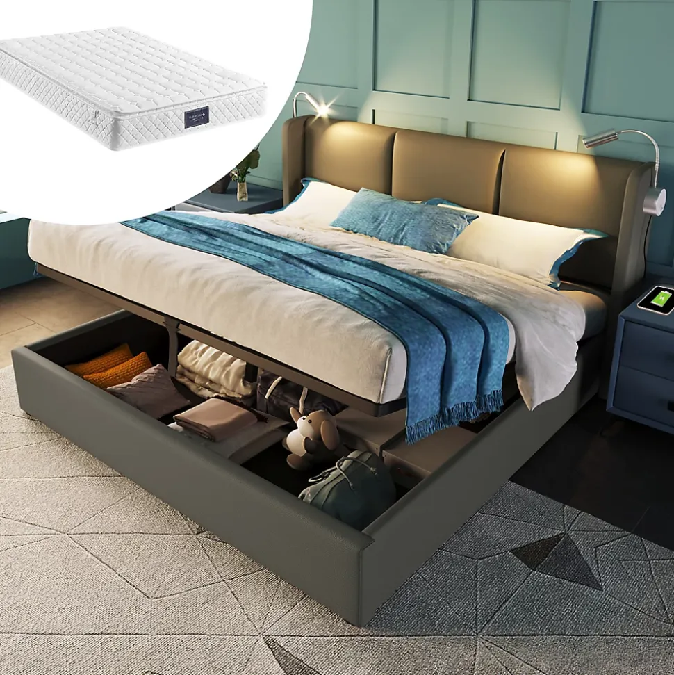 Design & styleCe lit 160×200 cm combine une esthétique contemporaine et des matériaux pensés pour la chambre : revêtement PU gris élégant, tête de lit rembourrée et structure métallique renforcée. Dimensions totales du produit : 206x165x107 cm, finition sobre pour une intégration facile dans un intérieur moderne.Fonctionnalité & rangement Sommier relevable assisté par vérins hydrauliques offrant un grand espace de rangement sous le lit (espace intérieur 193×153 cm) pour couettes, oreillers et linge de maison. Tête de lit équipée d’une liseuse orientable et d’une prise USB intégrée pour recharger vos appareils sans quitter le lit ; éclairage conçu pour ne pas gêner le partenaire. Sommier à lattes inclus, compatible avec matelas 160×200 cm (matelas non fourni).Matériaux & sécuritéCadre principal en métal pour une stabilité durable, lattes en bois massif pour un soutien élastique et confortable. Revêtement en PU facile d’entretien et résistant aux usages quotidiens. Charge maximale recommandée : 300 kg.EntretienSurface en PU nettoyable à l’aide d’un chiffon doux légèrement humide ; éviter les produits abrasifs ou solvants. Une doublure en tissu Oxford sous le sommier limite l’entrée de poussière et prolonge la durée de vie du rangement.Installation & emballageMontage requis, deux personnes recommandées. Produit livré en 3 colis qui peuvent arriver séparément ; contenu du colis : cadre de lit, sommier à lattes, liseuse avec fonction de charge USB. En cas de pièces manquantes à la réception de tous les colis, contacter le service client.