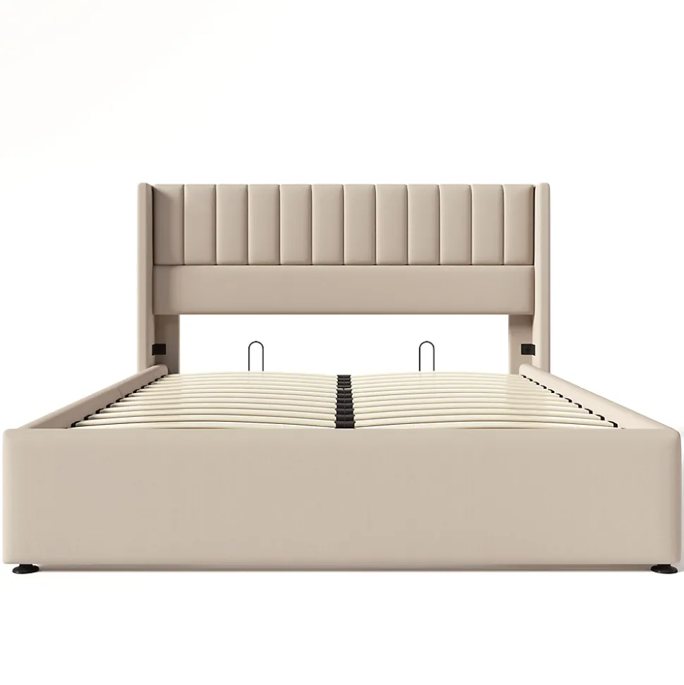 - Design contemporain et sobre avec revêtement en lin beige et tête matelassée à rayures verticales; la traverse latérale incurvée empêche le glissement du matelas et assure une intégration discrète dans la chambre.