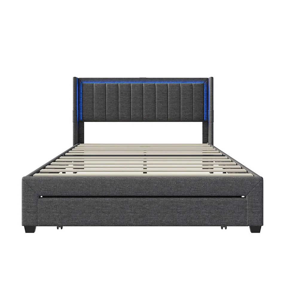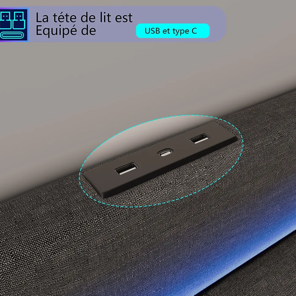 【Station de charge USB】Ce lit combine astucieusement un design élégant et un confort maximal. Les ports de charge sur la tête de lit comprennent des ports USB et Type-C, ce qui permet de charger vos appareils électroniques facilement. Vous pouvez charger votre téléphone et votre tablette avant de vous coucher pour les utiliser confortablement au lit.【Éclairage LED】La tête de lit est équipée de lumières LED, ajoutant une touche moderne à votre chambre. La tête de lit LED peut servir de dossier confortable lors de la lecture ou du visionnage de la télévision. Avec la télécommande, vous pouvez changer la couleur et la luminosité pour vous allonger confortablement.【Matériau doux pour la peau】Le tissu en lin doux réduit efficacement le risque de blessures causées par des coins et des bords pointus pendant l’utilisation, s’intégrant parfaitement dans votre chambre pour offrir un style chic et minimaliste qui reflète votre quête de qualité de vie.Description:Matériau : Lin + MDFCouleur : GrisNombre de colis : 2Assemblage requis : oui.Temps de montage estimé : 1 heureNombre de personnes recommandées : 2Dimensions du lit : 160 x 200 cm (sans matelas)Poids du produit : 53 kgCapacité de charge maximale : 250 kgDimensions du produit : 204 x 164 x 114 cmRemarque sur les dimensions : Toutes les dimensions sont approximatives