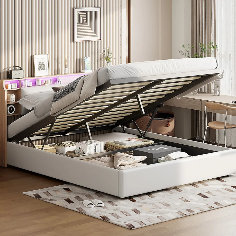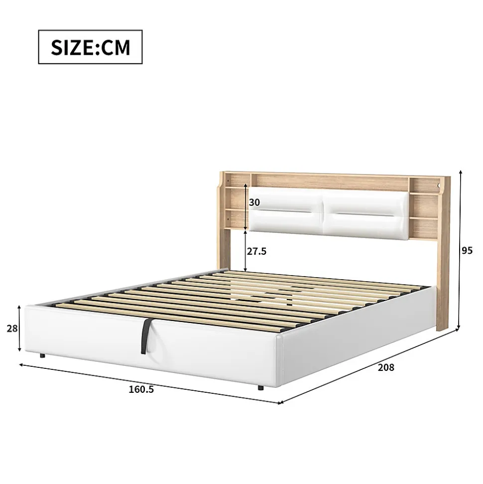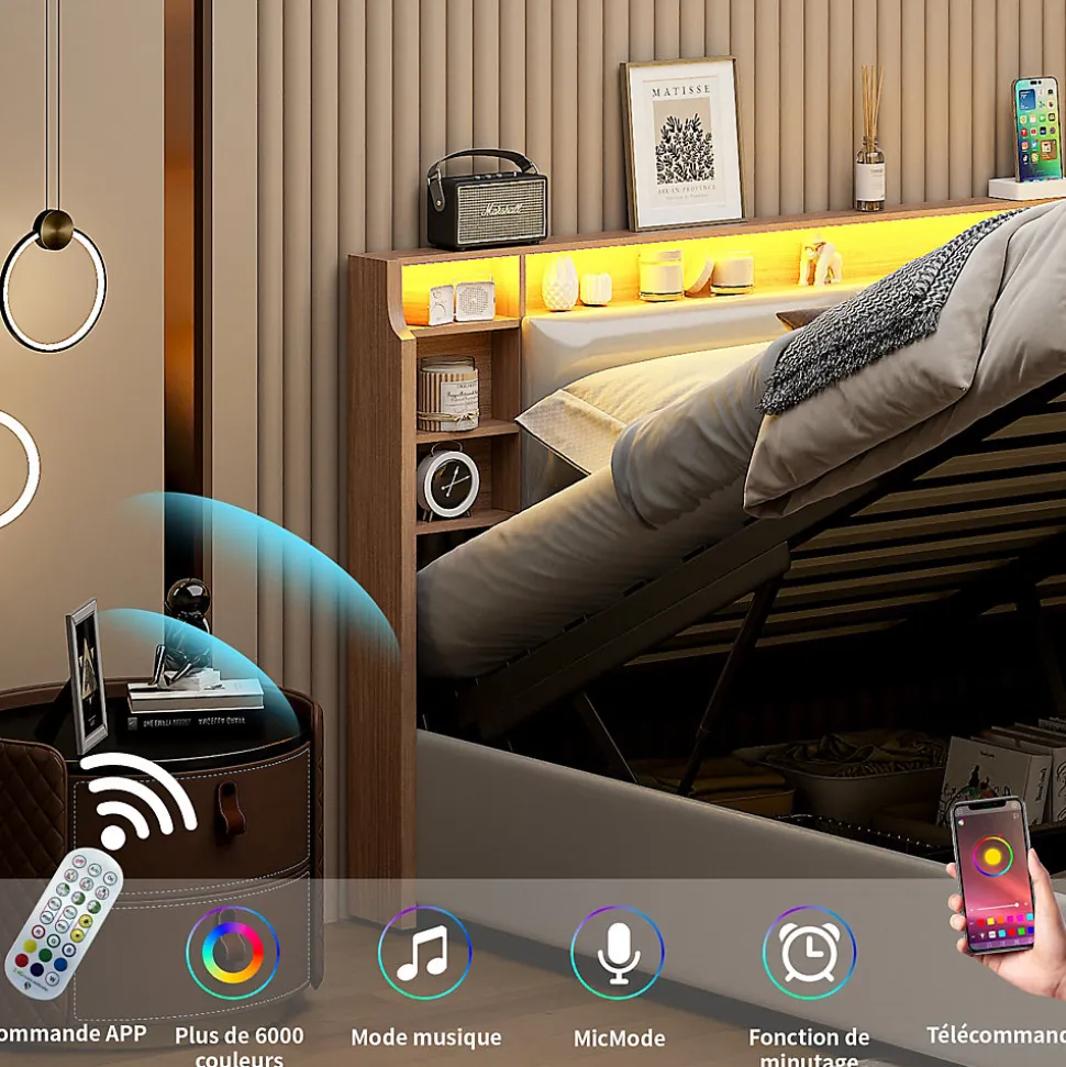 Design Multifonctionnel : Profitez dun cadre de lit moderne 160×200 cm avec sommier à lattes intégré. La tête de lit est équipée de 3 compartiments spacieux pour ranger vos livres, réveils ou autres accessoires.Rangement Pratique : Le lit dispose dun coffre de rangement avec mécanisme hydraulique, idéal pour stocker vos draps, oreillers et couvertures, tout en optimisant lespace de votre chambre.Éclairage LED et Port USB : Tête de lit avec LED intégrée réglable via télécommande ou smartphone. Deux ports USB permettent de recharger vos appareils électroniques facilement.Matériaux Haut de Gamme : Cadre en PU blanc imperméable et facile à nettoyer, offrant une finition élégante et durable pour un style contemporain.Livraison en Plusieurs Colis : En raison des grandes dimensions du lit, celui-ci sera livré en 2 colis séparés. Ne vous inquiétez pas si tous les colis narrivent pas en même temps.Lit double rembourré, espace de rangement hydraulique, tête de lit avec éclairage LED.Remarques : En raison de mesures manuelles, une erreur de 2 à 3 cm peut se produire. Ce produit sera livré en 2 colis. Ils peuvent ne pas arriver en même temps. Veuillez patienter. Si le client a des questions pendant l’installation, veuillez nous contacter dès que possible.Description Matériau : Bois massif + PU + Métal Couleur : Blanc Nombre de colis : 2 Assemblage requis : oui Dimensions du produit : 208 x 160.5 x 95 cm Dimensions du lit : 160 x 200 cm (sans matelas) Poids du produit : 47 kg Charge maximale du lit : 300kg