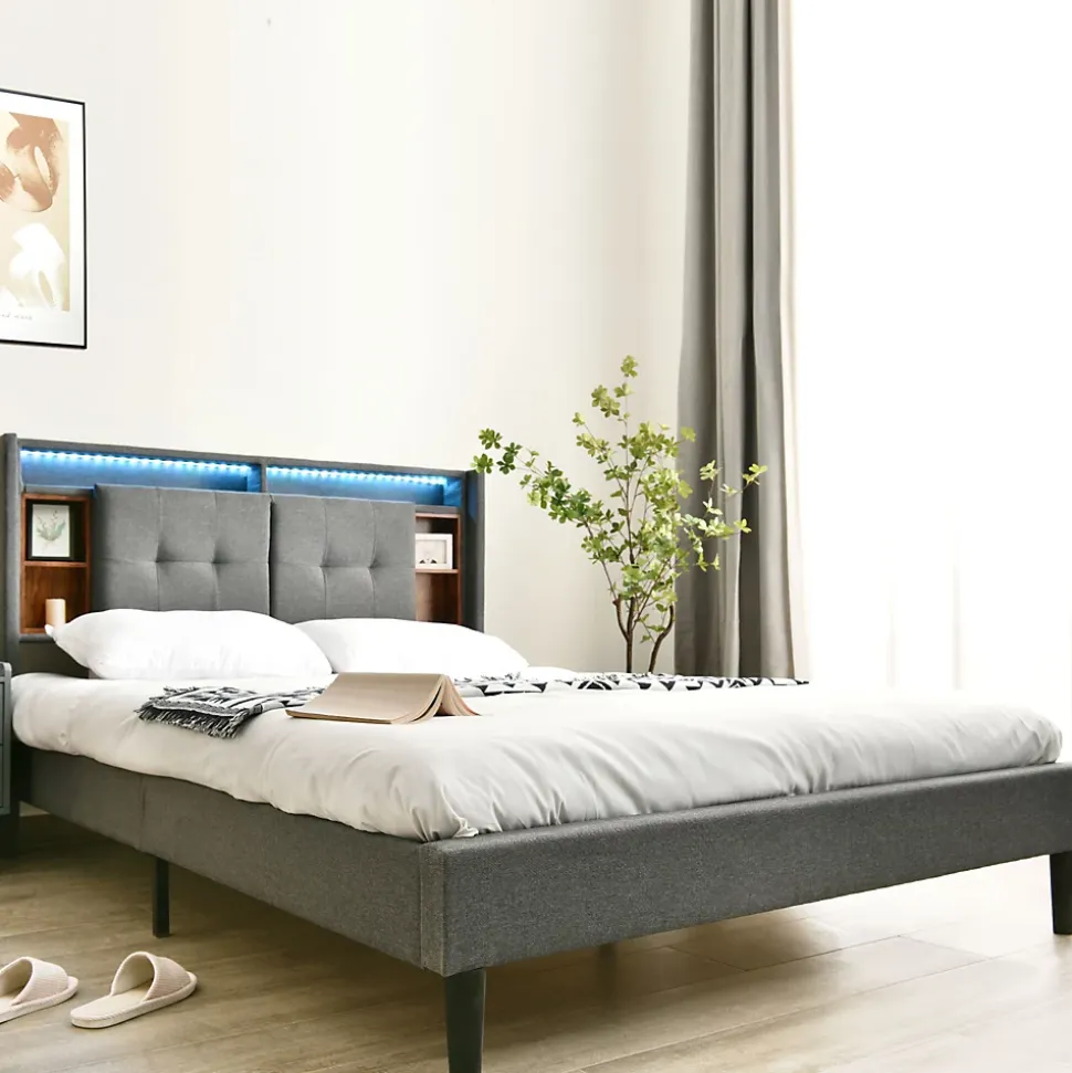 Design & styleCe lit tapissé en lin gris allie une silhouette contemporaine à des proportions étudiées. La tête de lit intégrée offre des compartiments externes visibles et un grand espace interne dissimulé, assurant un rendu soigné et une présence discrète dans la chambre sans encombrer l’espace.Fonctionnalité & rangementTête de lit multifonctionnelle avec six niches externes et un compartiment interne pour ranger oreillers, couvertures et accessoires.Station de charge intégrée (2 USB, 2 prises) pour recharger smartphone et tablette ; ruban LED avec changement de couleur et modes, dont un mode « musique » synchronisant l’éclairage (le produit n’émet pas de son).Optimise l’espace sans nécessiter de meuble supplémentaire, facilitant l’usage quotidien.Dimensions & compatibilitéDimensions totales : 215x169x107 cm (LxPxH). Compatible avec matelas 160×200 cm (non fourni). Profondeur utile de la tête de lit : 28 cm. Aucun boxspring nécessaire, compatible avec différents types de matelas adaptés.Matériaux & confortStructure en bois massif et éléments métalliques pour robustesse ; lattes 100 % bois massif avec renforts métalliques et pieds centraux assurent stabilité et bonne répartition des charges. Revêtement en lin gris, surfaces douces et bords arrondis pour limiter les risques de chocs. Capacité d’utilisation : environ 200 kg.Installation & emballageMontage requis, deux personnes conseillées. Livré en 2 colis pouvant arriver séparément ; vérifier la réception complète. Soulever le lit lors des déplacements pour éviter les dommages. Entretien simple : dépoussiérer et nettoyer avec un chiffon doux. En cas de pièces manquantes, suivre la procédure de retour ou assistance indiquée par le vendeur.