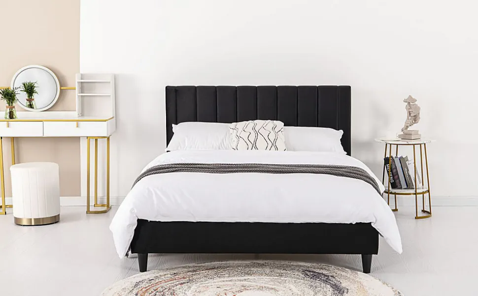 Ajoutez une touche de modernite à votre chambre avec ce joli lit de 160×200 cm avec un revêtement en velours ! Cette structure de lit apportera de l’elegance à votre chambre grâce à ses lignes epurees et son coloris sobre. Il vous offre tout le confort que vous pouvez rechercher grâce à sa tête de lit effet capitonne en velours.Caractéristiques techniques :Couleur lit : NoirCouleur pieds : NoirStructure : PlywoodNombre de lattes : 24 lattes en peuplierPieds : PlastiqueRevêtement : 100% polyesterFinition : VeloursPoids maximum supporte : 180 kgEntretien :Pour bien entretenir votre lit, utilisez un chiffon doux legèrement humide. N’utilisez pas de solvant.DimensionsStructure de lit : 214 x 165 x 101,5 cm / 38 kgTaille du couchage : 160 x 200 cmDimensions tête de lit : 165 x 8 x 90 cmNombre de latte : 24Conditionnement:Livre non monte, conditionne dans 1 carton. Notice de montage incluse.Colis : 169,5 x 15 x 91,5 / 41,5 kg