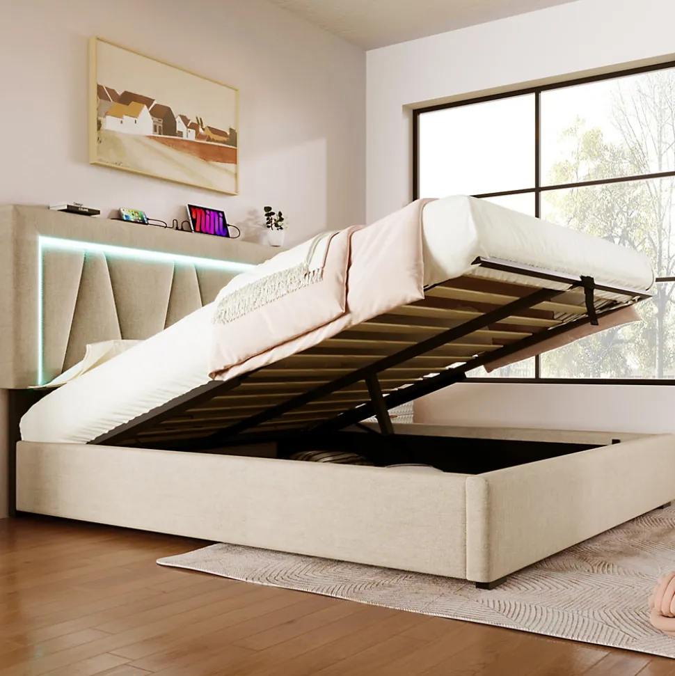 Design & styleCe lit 160×200 cm associe une esthétique moderne à une construction fonctionnelle : tête de lit tapissée en lin beige, boutons décoratifs et réglage de hauteur d’environ 20 cm pour adapter l’appui selon la taille et le confort souhaité.Fonctionnalité & rangement Sommier relevable assisté par vérins à gaz, donnant accès à un coffre de rangement spacieux sous le couchage pour draps, couettes ou bagages. Tête de lit intégrant une station de charge (1 USB + 1 Type‑C) et un ruban LED avec télécommande pour choisir couleur, intensité et effets selon l’ambiance recherchée. Solution pensée pour optimiser l’espace et organiser la chambre sans mobilier supplémentaire.Matériaux & entretienCadre principalement en métal pour une bonne stabilité, revêtement en lin beige agréable au toucher. Convient à une épaisseur de matelas de 12 à 32 cm (matelas non fourni). Surfaces faciles à entretenir : nettoyer avec un chiffon doux et sec ou légèrement humide.Installation & emballageMontage requis, deux personnes recommandées. Produit livré en 2 colis pouvant arriver séparément ; vérifiez le contenu de chaque colis à la réception. Pour limiter les risques d’endommagement, soulevez le lit pour le déplacer, n’hésitez pas à contacter le service client si un élément manque.Informations techniquesDimensions totales : 166,5 x 208 x 90,5–110,5 cm (L x P x H). Format de matelas recommandé : 160 x 200 cm. Charge maximale : 360 kg. Poids brut/net approximatif : 51,1 / 48,1 kg. Contenu de la livraison : cadre de lit avec sommier relevable, station USB + Type‑C, éclairage LED.