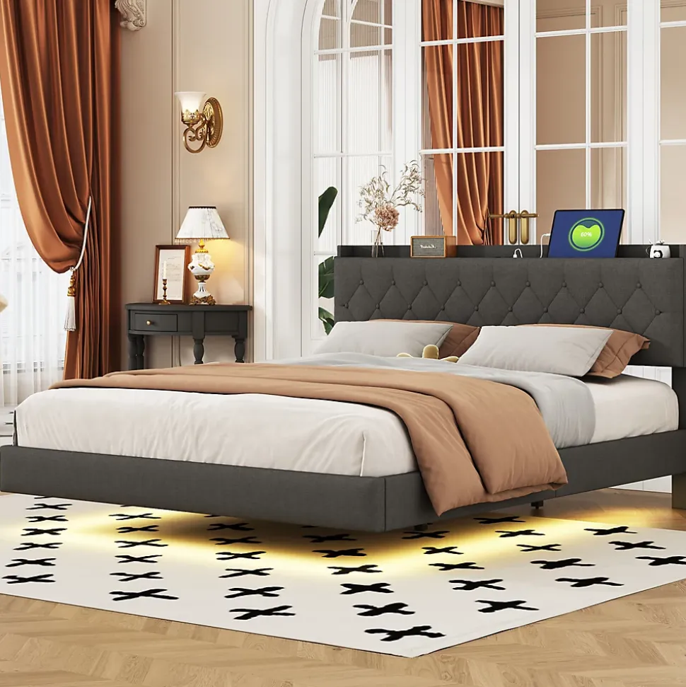 Design & styleCe lit 160×200 cm tapissé en tissu lin gris propose un look moderne et raffiné. La tête de lit réglable en hauteur s’adapte aux différentes épaisseurs de matelas et apporte un soutien confortable pour la lecture ou la détente. La finition sobre s’intègre facilement dans une chambre contemporaine.Fonctionnalité & rangement Bande LED multicolore discrètement intégrée sous le cadre, plusieurs modes d’éclairage pour personnaliser l’ambiance selon l’heure ou l’activité. Prise USB intégrée sur le cadre pour charger vos appareils sans chercher de prise murale. Coffre de rangement relevable côté table de chevet, pratique pour ranger linge, oreillers ou petits objets et garder la chambre ordonnée.Structure & confortCadre conçu avec une ossature métallique renforcée, panneaux MDF et contreplaqué, et 12 lattes pour un soutien homogène. Capacité de charge maximale 250 kg. Recommandation d’utilisation avec matelas d’une épaisseur comprise entre 23 et 30 cm pour un maintien adapté.Matériaux & entretienTissu tapissé en lin agréable au toucher, résistant à l’usure et facile d’entretien. Nettoyer avec un chiffon doux et éviter les produits abrasifs ou solvants. Les surfaces métalliques et panneaux peuvent être essuyés avec un chiffon légèrement humide.Installation & livraisonProduit livré en 2 colis (peuvent arriver séparément). Montage requis, deux personnes recommandées, durée estimée 2 heures. Tous les outils nécessaires sont fournis; l’utilisation d’outils électriques est déconseillée. Dimensions totales : 203x164x100 cm, poids total du colis environ 45 kg.