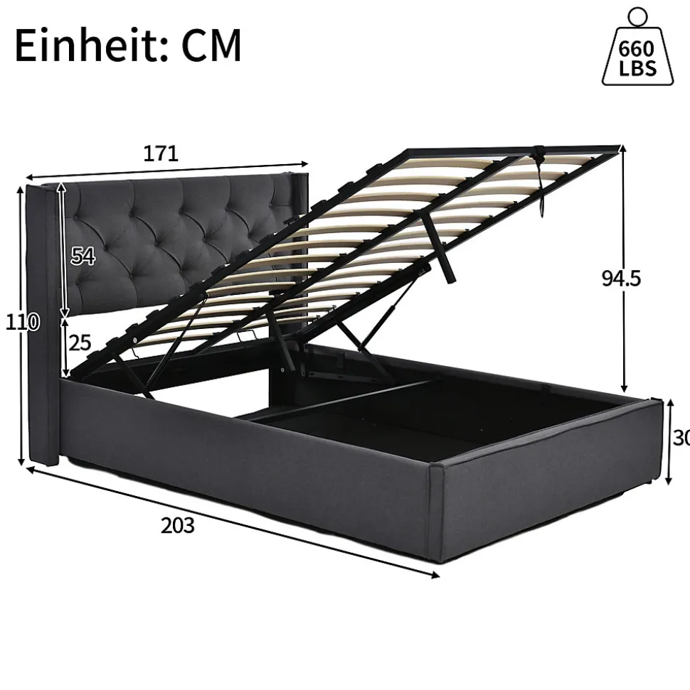 Design & styleCe lit 160×200 cm associe un revêtement en coton gris et une tête de lit capitonnée pour un rendu à la fois contemporain et légèrement rétro. Les finitions bois et métal offrent une esthétique soignée et une présence discrète dans la chambre, adaptée à divers styles d’intérieur.Fonctionnalité & rangement Grand coffre de rangement sous le sommier relevable, accessible grâce à des vérins hydrauliques pour un usage quotidien aisé. Espace utile intérieur 193×153 cm, idéal pour couvertures, oreillers et linge de lit, avec fond en tissu Oxford anti-poussière pour préserver le contenu. Bandes antidérapantes au niveau des lattes pour limiter le glissement du matelas et améliorer la stabilité.Matériaux & confortStructure combinant panneaux massifs, éléments métalliques et rembourrage en coton ; lattes en pin élastiques conçues pour offrir un soutien progressif et prolonger la durée d’utilisation de la literie. Les textiles sont testés selon la norme Oeko‑Tex Standard 100 et adaptés aux personnes sensibles.Matelas compatible & caractéristiquesCompatible avec matelas 160×200 cm (matelas non fourni avec le cadre). Exemple de matelas adapté : noyau à ressorts ensachés et couches de mousse, hauteur 25 cm, 7 zones de confort, env. 720 ressorts, fermeté H3, ventilation renforcée et qualité anti‑acarienne pour un couchage hygiénique.Installation & emballageMontage requis, deux personnes recommandées. Livré en plusieurs colis (3 colis pour réduire le risque d’endommagement) qui peuvent arriver séparément. Vérifier le contenu lors de la réception et contacter le service client en cas de pièces manquantes.