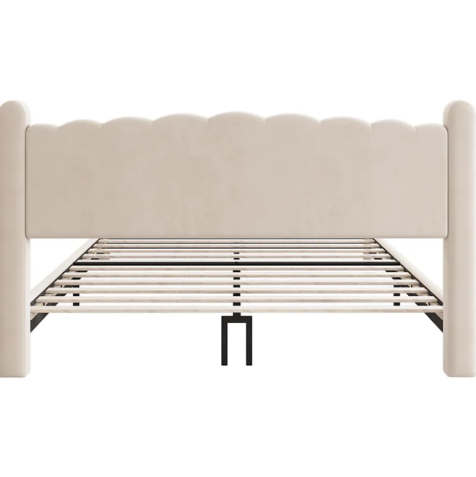 - Design élégant en velours beige avec tête de lit ondulée qui apporte profondeur et texture à la chambre; lignes soignées et finition douce pour une ambiance contemporaine et raffinée.