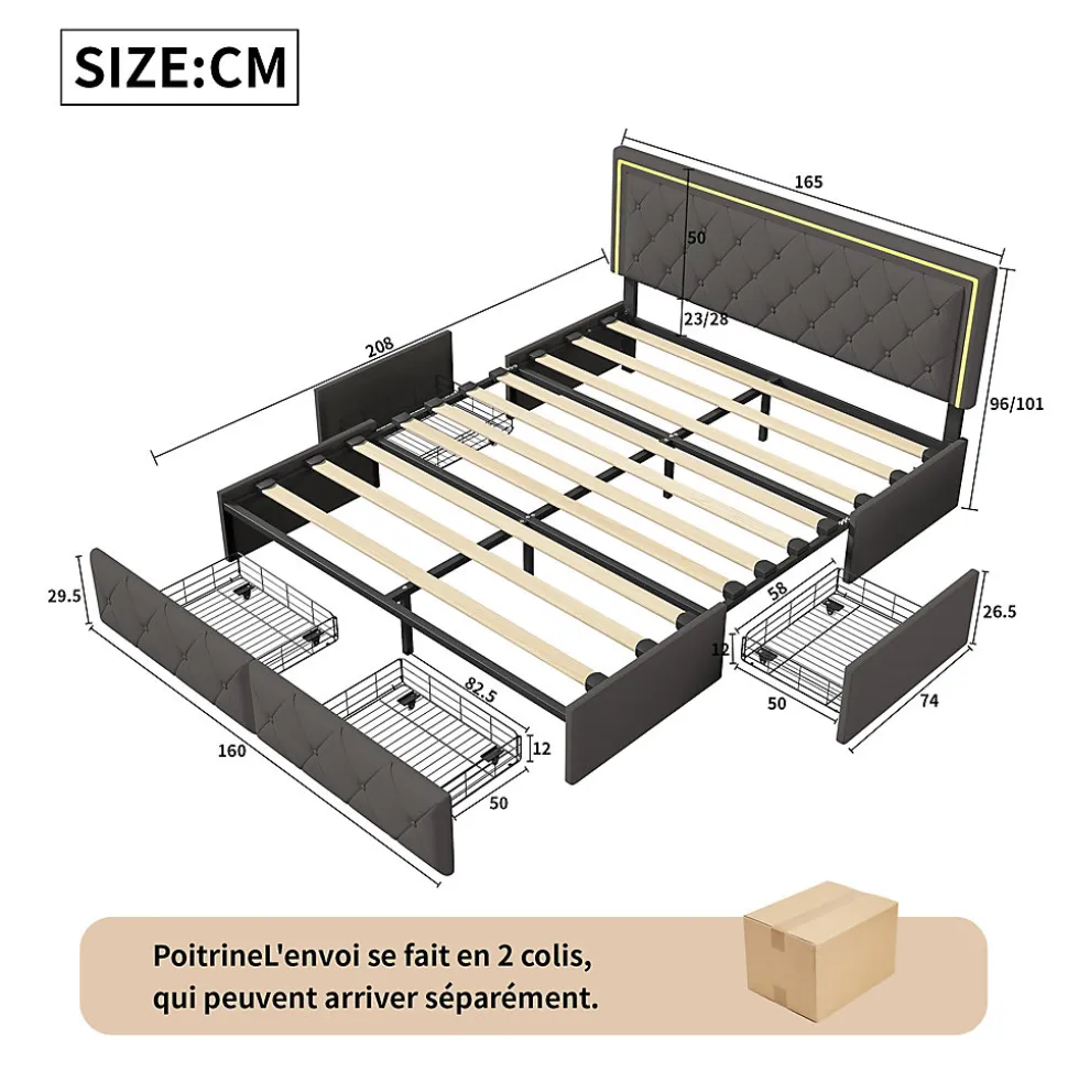éclairage led : la tête de lit est équipée de lumières led, ajoutant une touche moderne à votre chambre. Lors de vos lectures ou en regardant la télévision, la planche led de la tête de lit peut servir de dossier confortable. À l’aide d’une télécommande, vous pouvez changer les couleurs et ajuster la luminosité pour vous détendre confortablement. haute capacité de charge : les lattes métalliques de haute résistance et à double rangée peuvent supporter une charge allant jusqu’à 350 kg. Le matelas reste bien en place, créant un environnement de sommeil confortable. matériaux de haute qualité : le cuir de qualité réduit efficacement les risques de blessures pour vous ou votre famille dues aux coins et aux bords tranchants pendant l’utilisation. Il s’harmonise parfaitement avec votre chambre, offrant un style élégant et minimaliste qui met en valeur votre quête de qualité de vie. conception de rangement : le lit est doté de quatre grands tiroirs intégrés sous le sommier à ressorts, offrant un espace de rangement pratique pour vos draps, couvertures, oreillers, vêtements, chaussures, etc. Grâce aux roulettes situées sous les tiroirs, ils peuvent être facilement ouverts et fermés, rendant votre chambre plus ordonnée.descriptionlit double rembourré, espace de rangement, tête de lit, avec éclairage led.spécificationsmatériau : bois + pu+ métalnombre de colis : 2assemblage requis : ouitemps de montage estimé : 1 heurenombre de personnes recommandées : 2dimensions du produit : 208 x 145 x 96-101 cmdimensions du lit : 140 x 200 cm (sans matelas)poids du produit : 52 kgcharge maximale du lit : 350 kgavertissement de sûretéce lit est destiné à un usage adulte et ne doit pas être surchargé. Nettoyez les déversements promptement pour éviter d’endommager le lit.